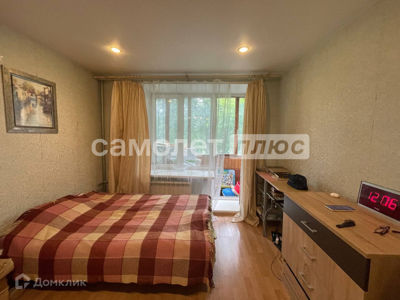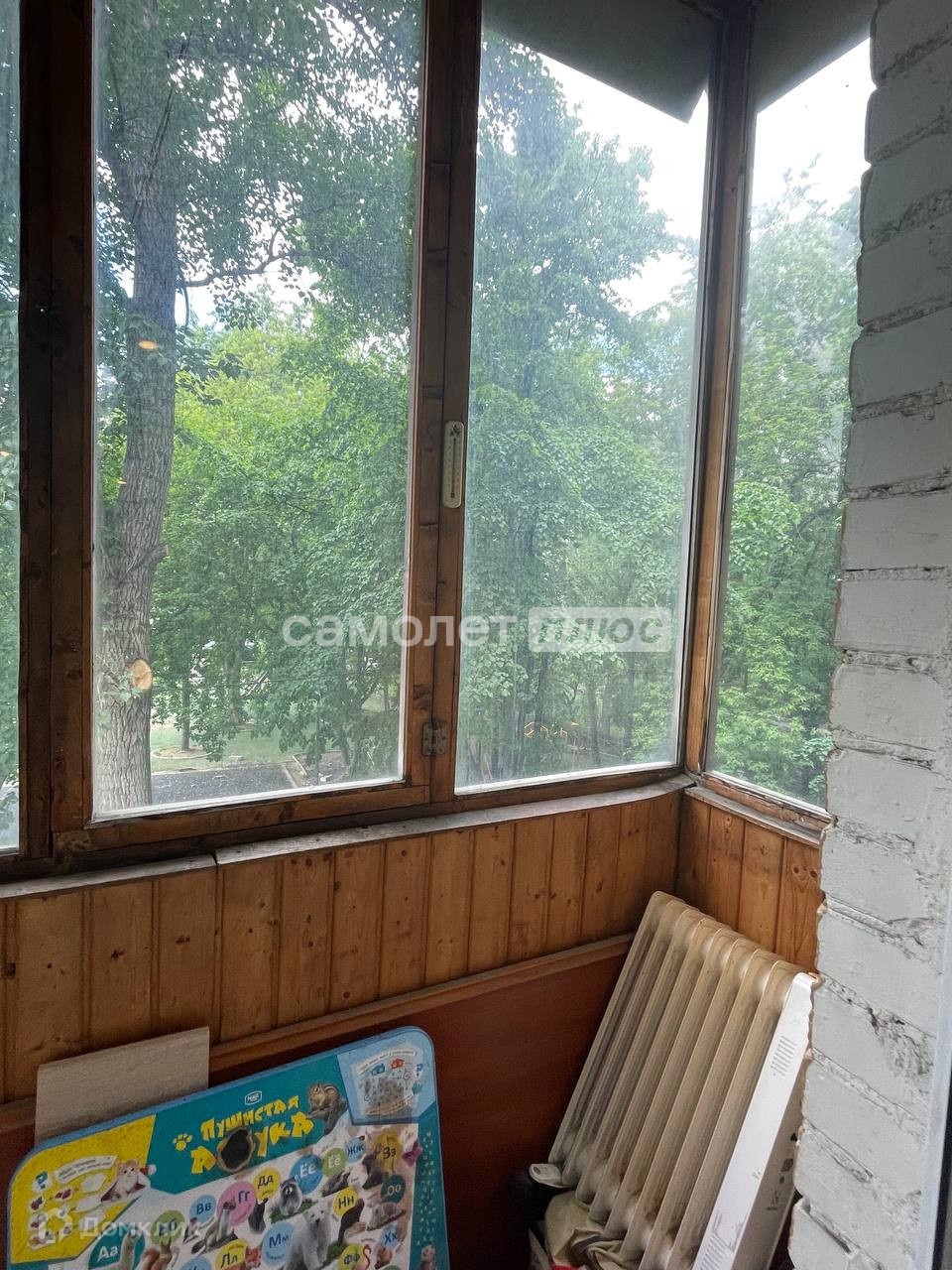 Жилая комната просторная, имеет выход на застекленный балкон с большими окнами и видом на прекрасную зеленую территорию двора.