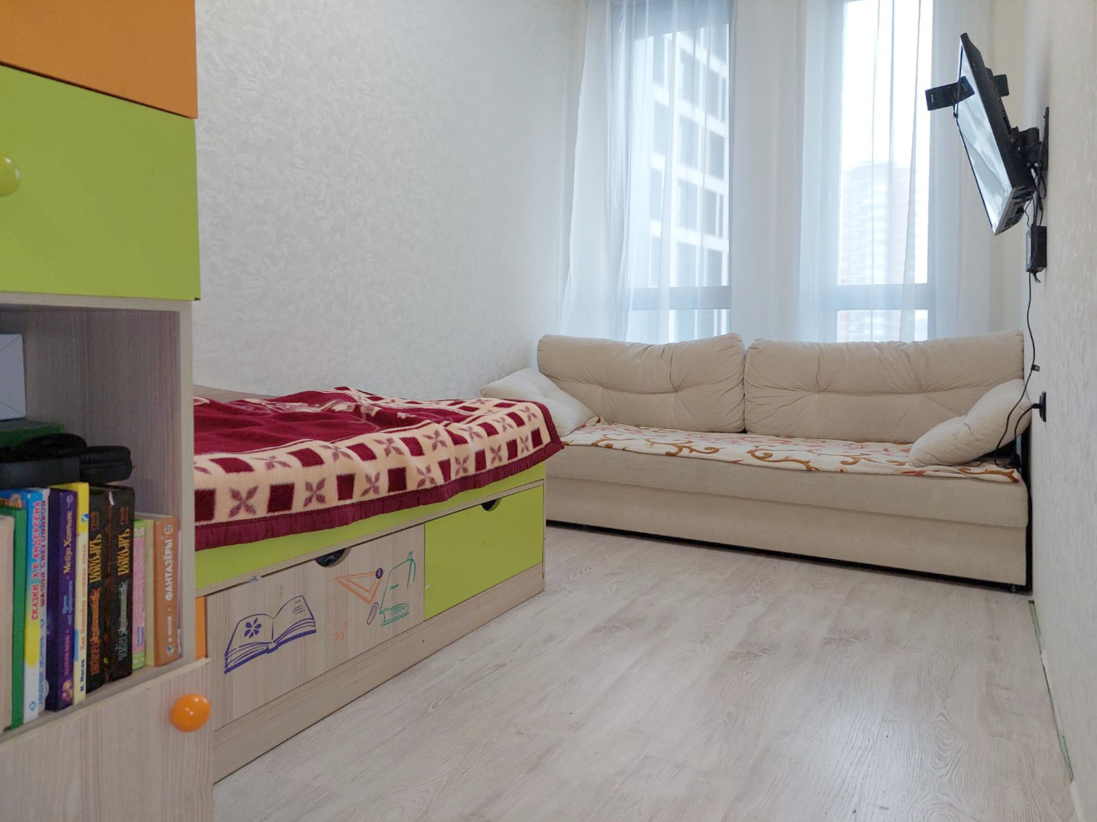 В квартире выполнена планировка формата 2+. Уютная спальня 9,1 кв. м. и детская 12,5 кв. м.. Зона кухни-гостиной 13,5 кв. м. оборудована кухонным гарнитуром. Совмещенный сан. узел.