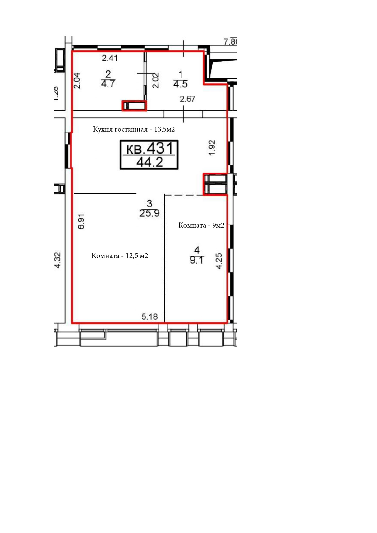Общая площадь 44.4 м2