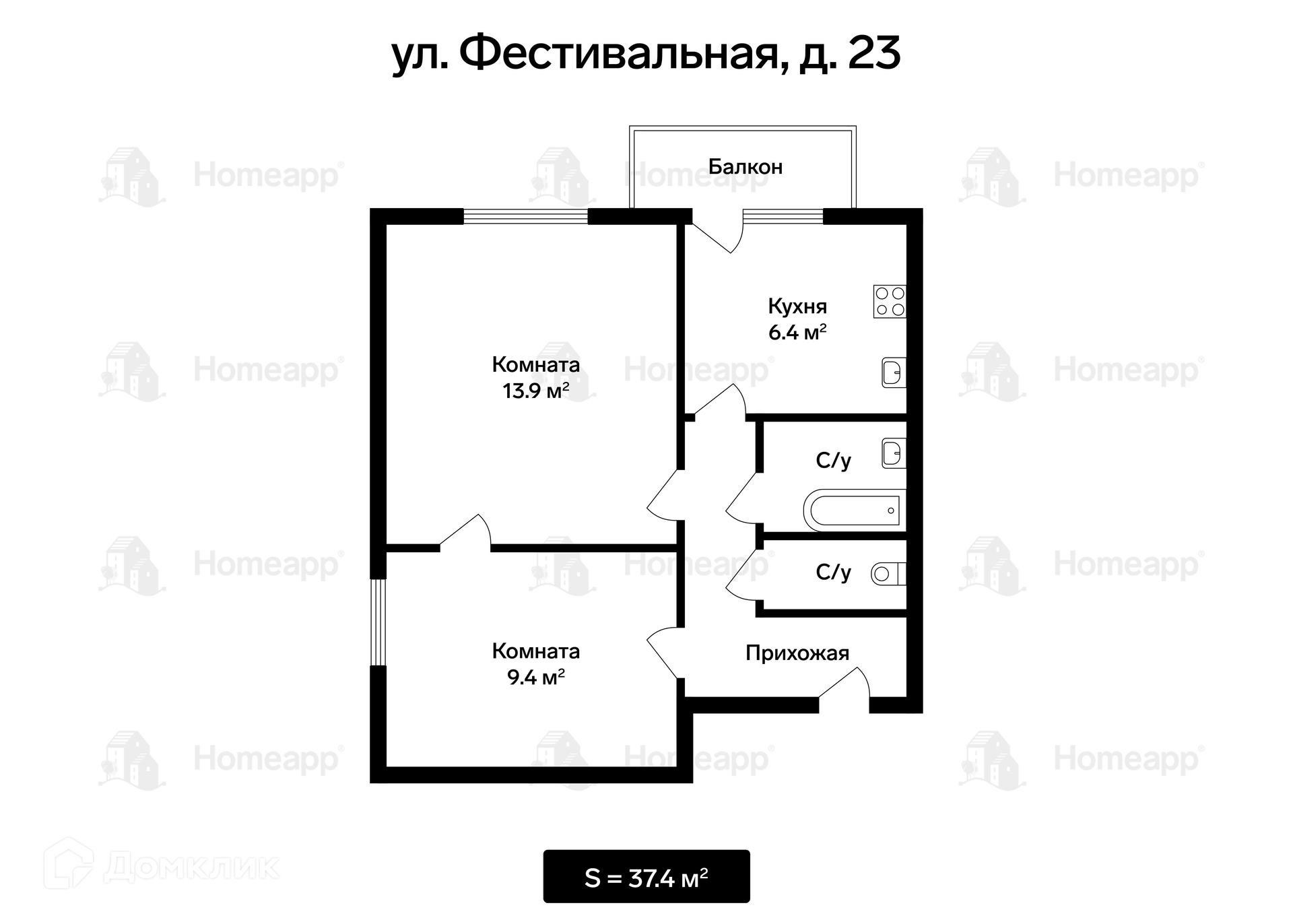 2-комнатная квартира, 37 м2, этаж 7 / 12, на продажу в Москве, Фестивальная улица, 23