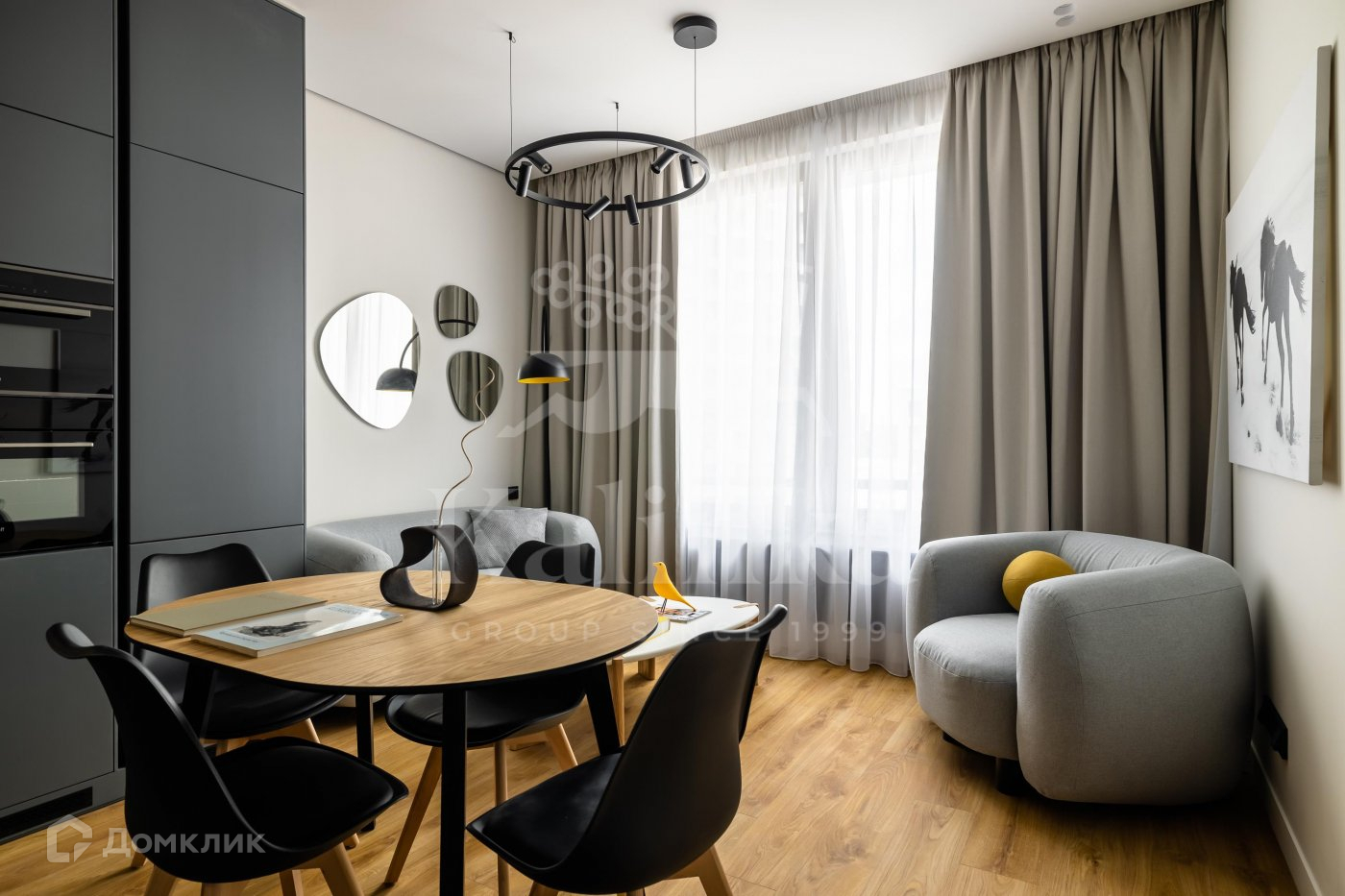 Планировка включает в себя кухню-гостиную, две спальни, две ванные комнаты и гардеробную.