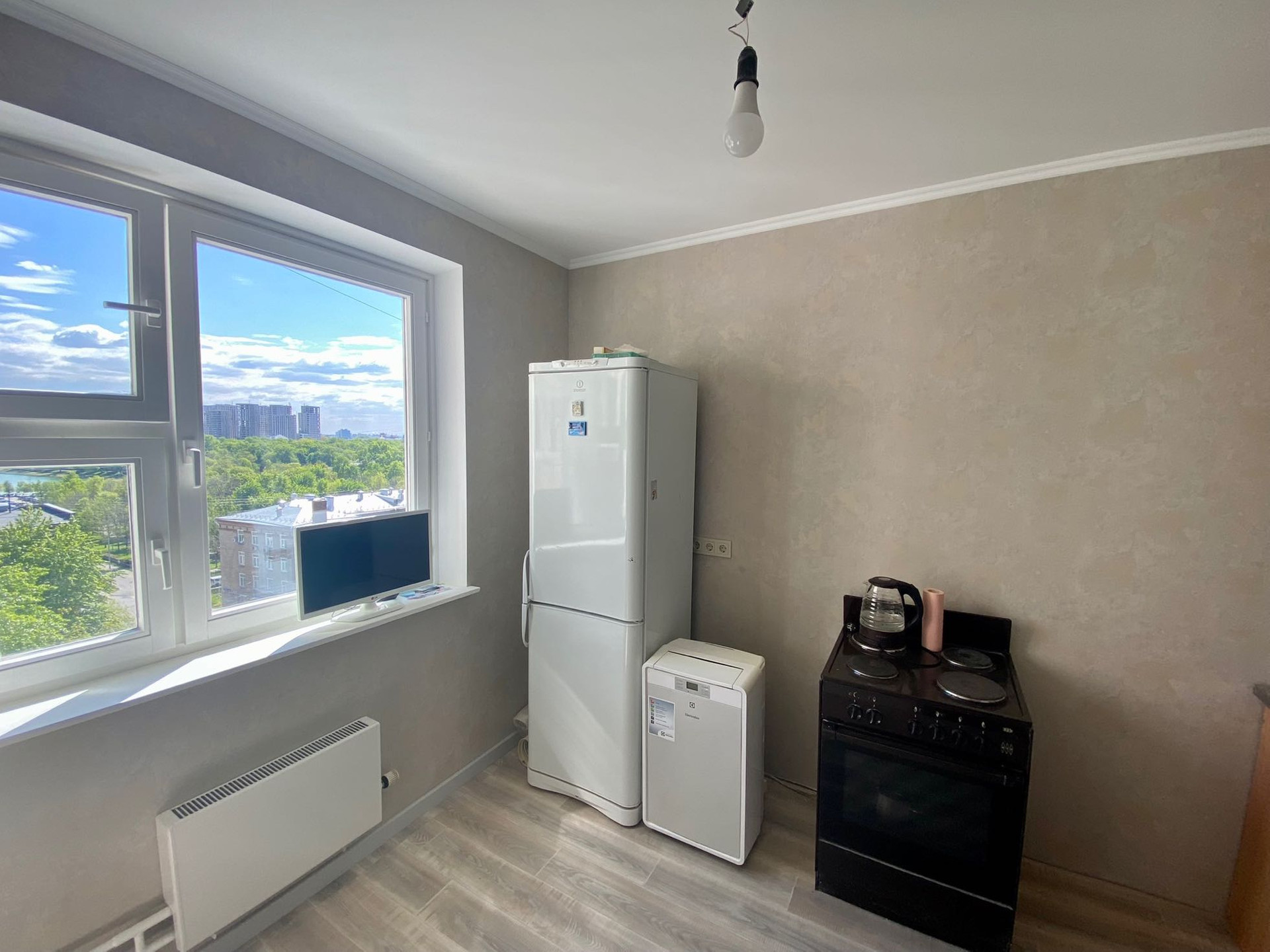 Просторная спальня/кухня/вместительная гардеробная и остеклённая лоджия, комфортный высокий потолок.