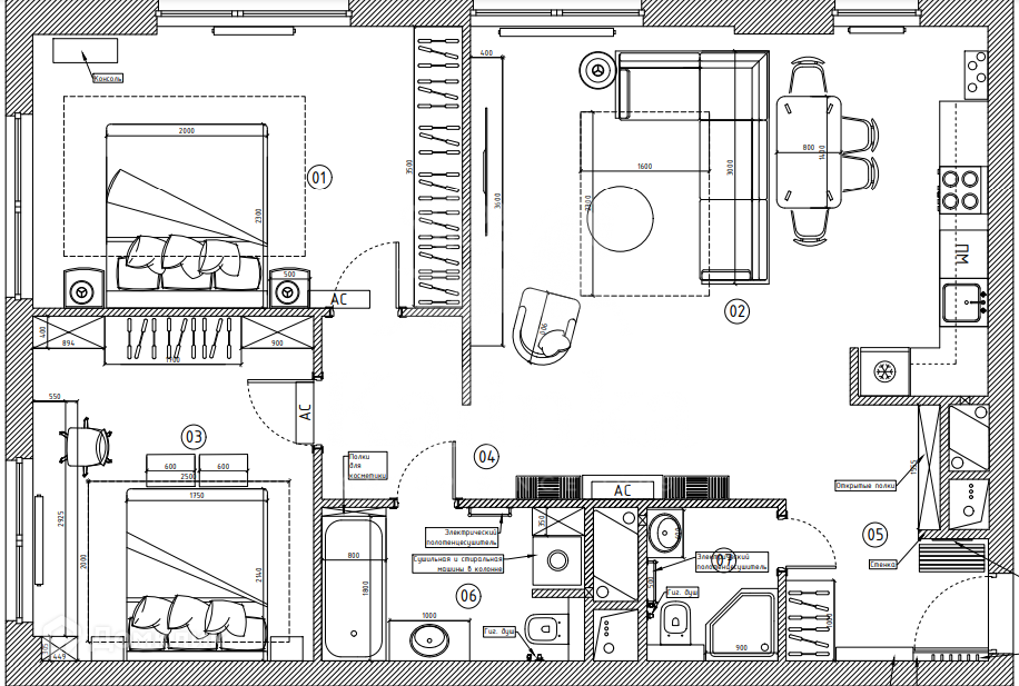 Планировка включает в себя кухню-гостиную, две спальни и две ванных комнаты.