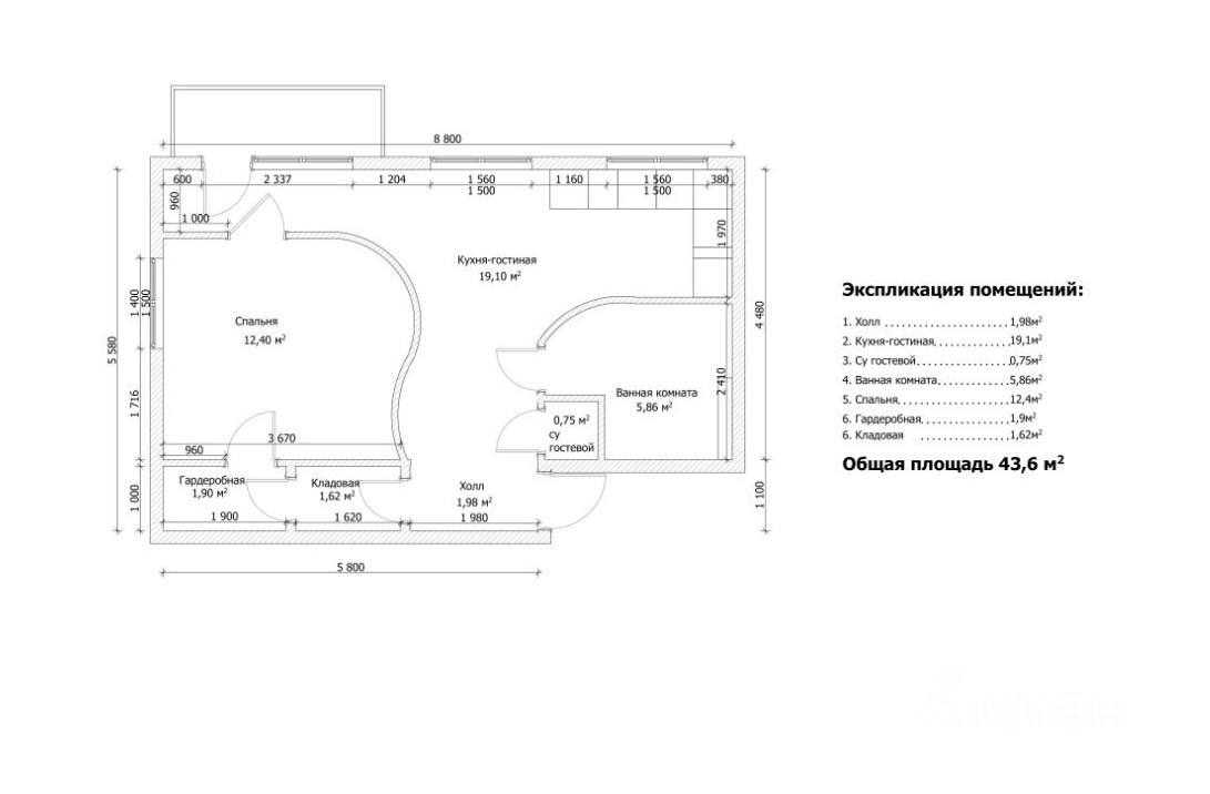 Общая площадь 43.6 м2