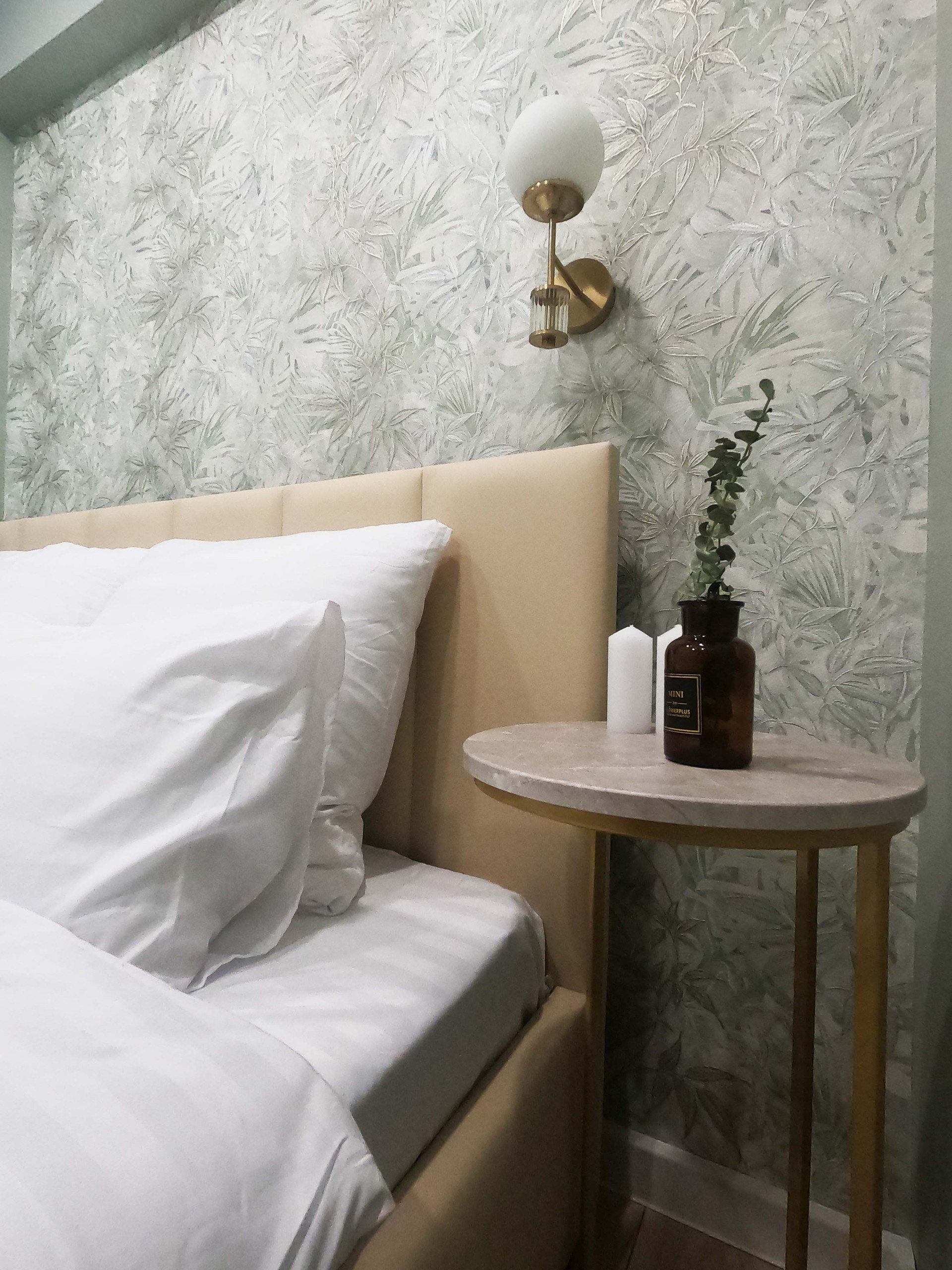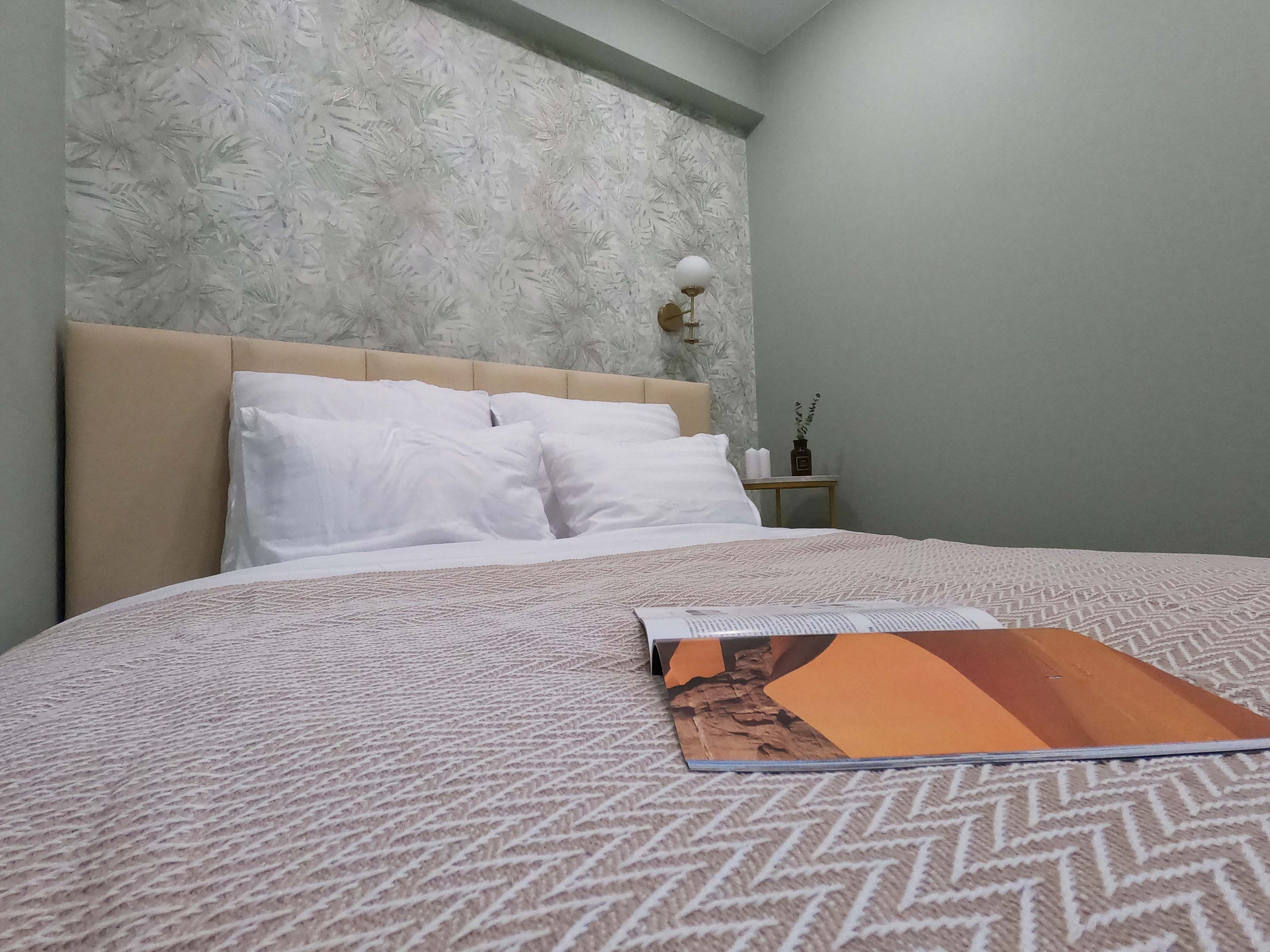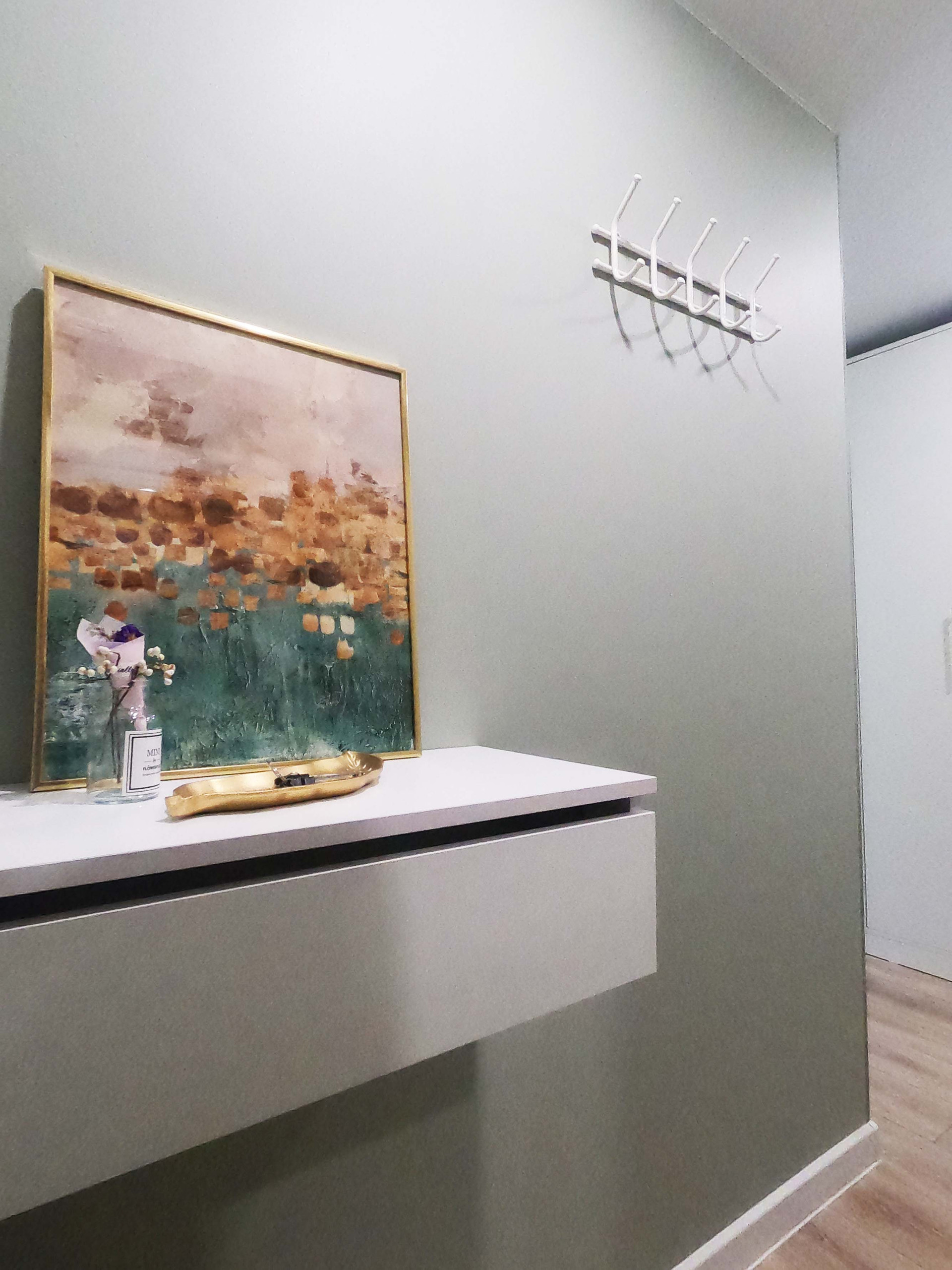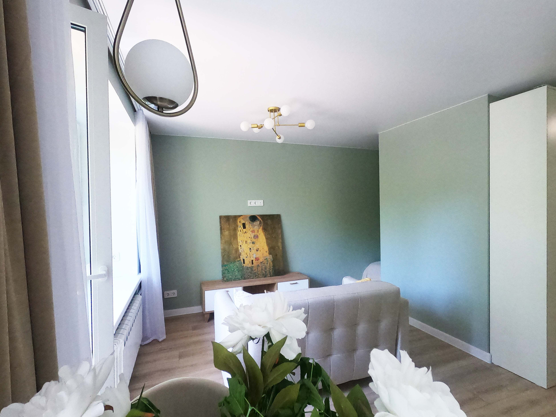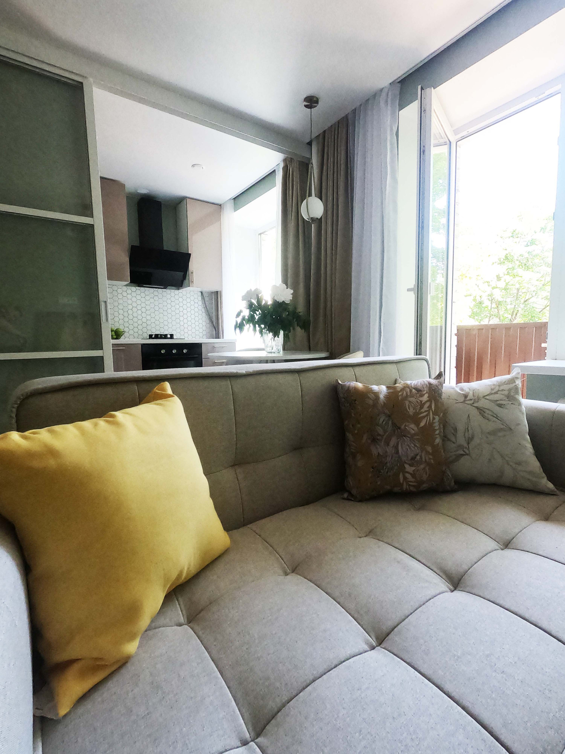 В квартире уютно расположилась спальня, кухня-гостиная и много мест для хранения. Есть балкон, из которого открывается прекрасный вид в зеленый двор (окна комнаты и кухни выходят в противоположную от станции сторону).
