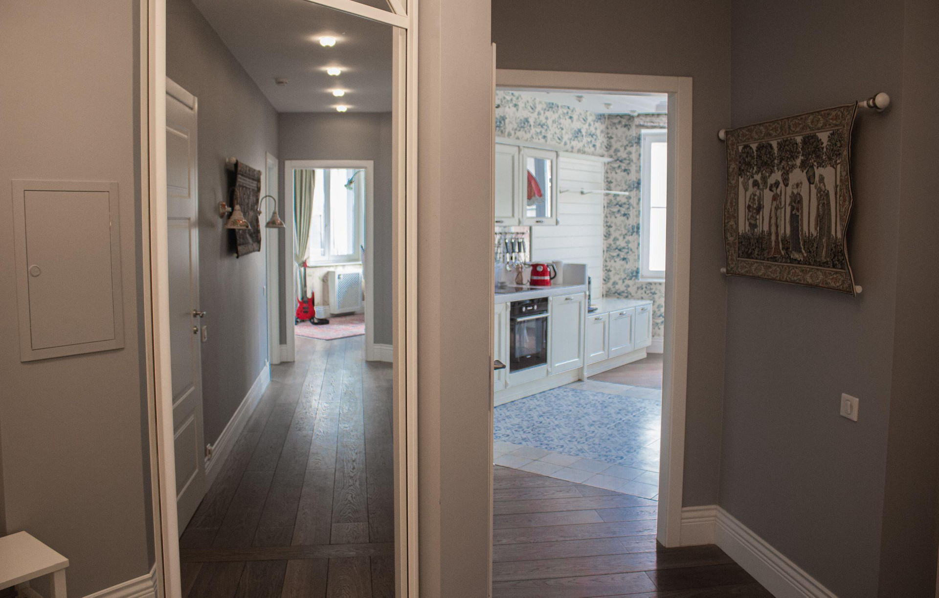 В квартире установлена система "Умный дом" с датчиками дыма и защитой от протечки. Все датчики Bosch Siemens и камеры с выводом на пульт и группу реагирования Delta.
