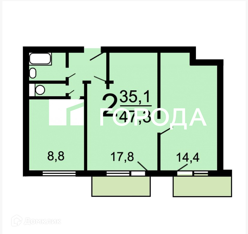 Две смежные комнаты 17,8 м. кв, и 14,4 м. кв. В каждой комнате остекленный балкон. Кухня 8,8 м. кв.м., санузел раздельный.