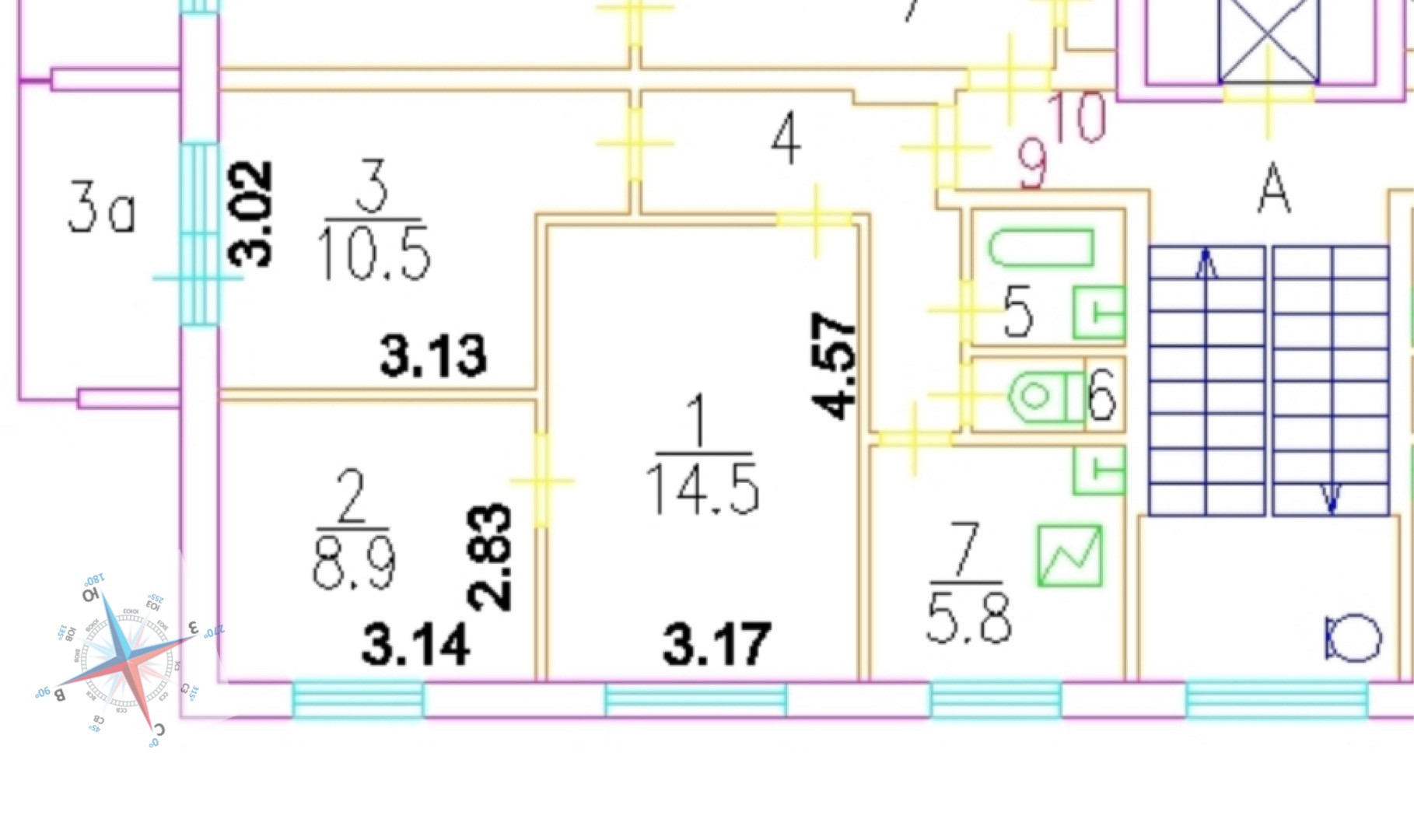 Каждая комната имеет площади 14.5, 10.5 и 8.9 соответственно.