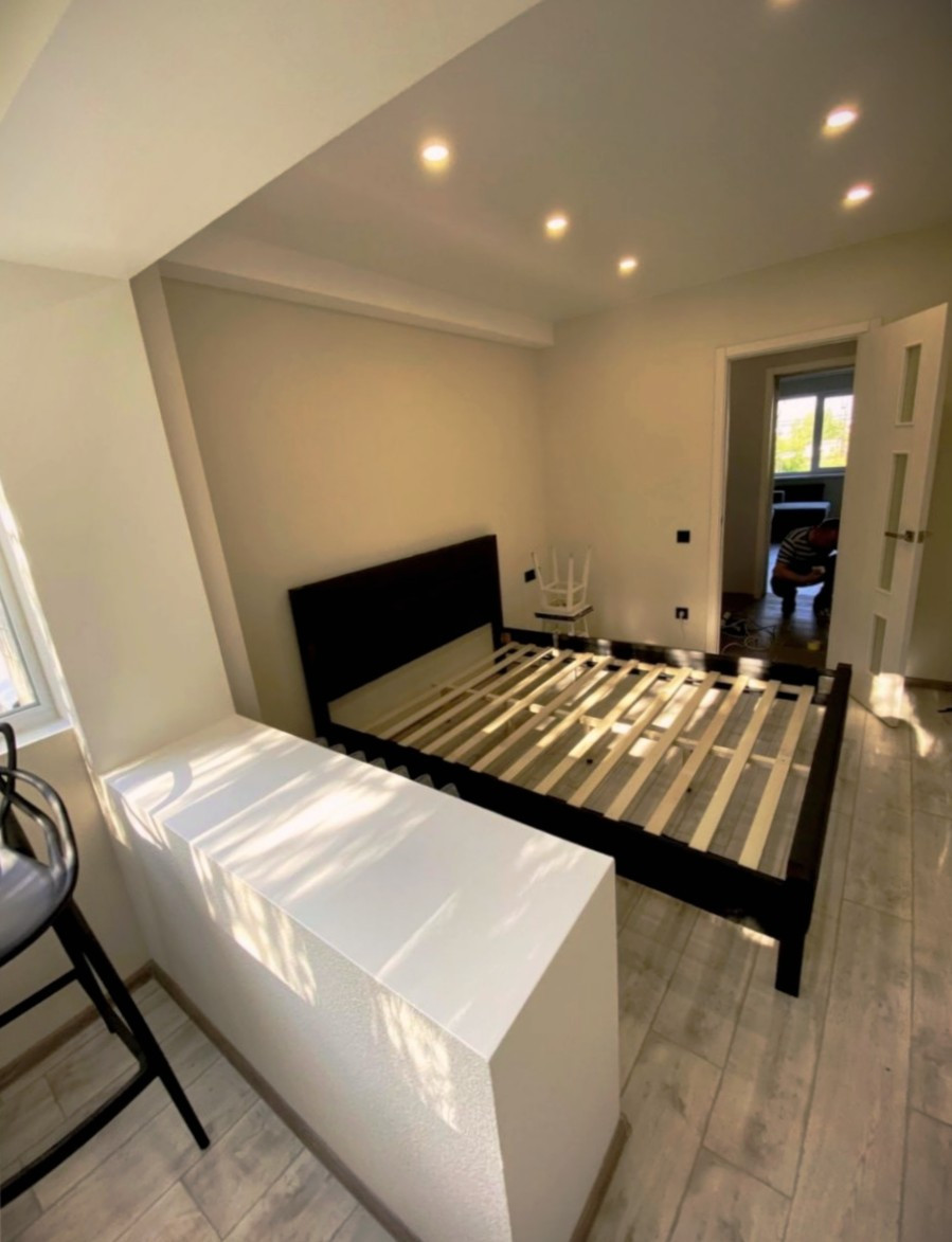 Спальня с высокими потолками и домашней атмосферой, широкая кухня, в каждой комнате оборудован тёплый пол с собственным выключателем, хорошая ванная с сантехникой с ярким освещением.