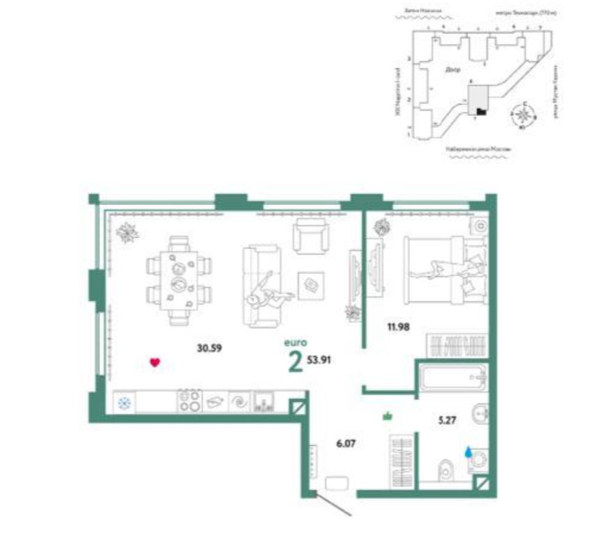 Общая площадь 53.9 м2