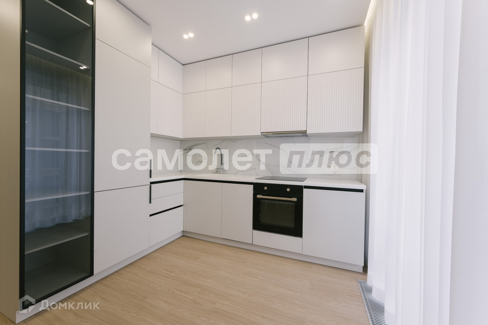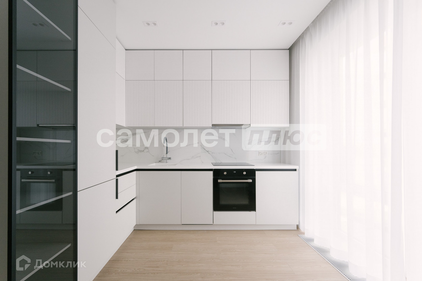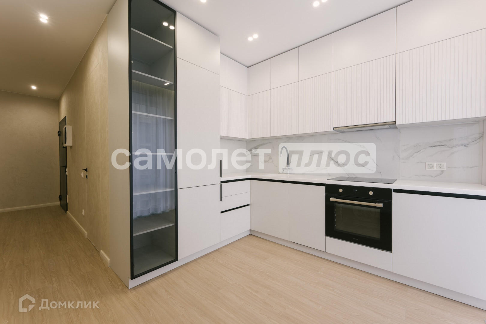 Полностью реализована кухня со встроенной мебелью (варочная панель, духовой шкаф, вытяжка, посудомоечная машина, холодильник).