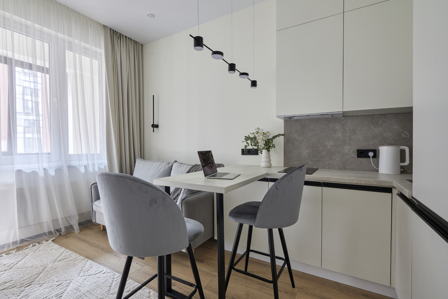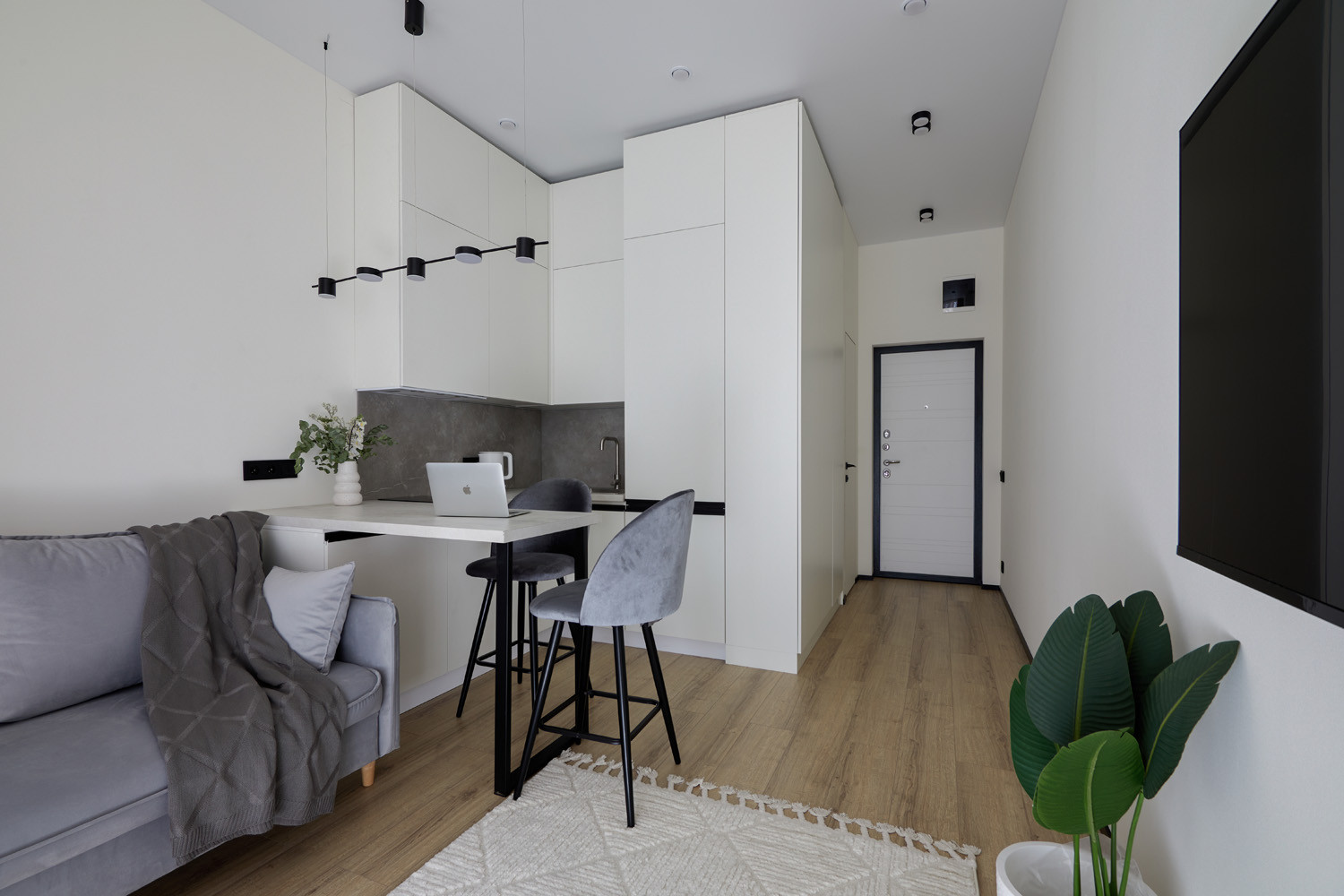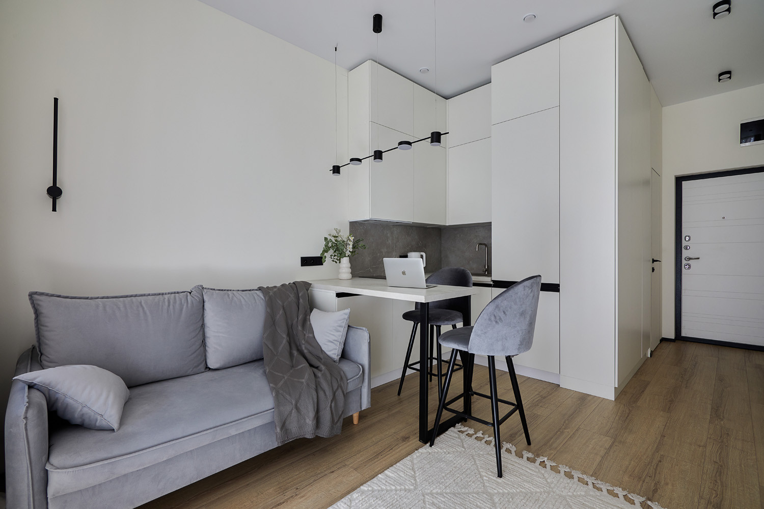 Очень грамотно зонировано пространство для комфортной жизни- есть зоны кухни, гостиной, спальни, предусмотрено достаточно мест хранения (кровать так же с подъёмным механизмом, это увеличивает места хранения), сделана шумоизоляция! Мы все продумали для Вас!