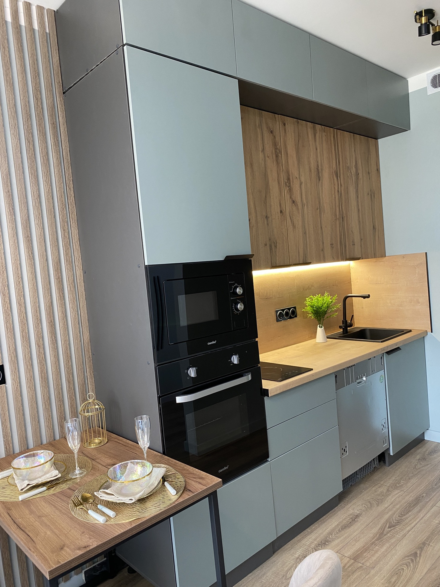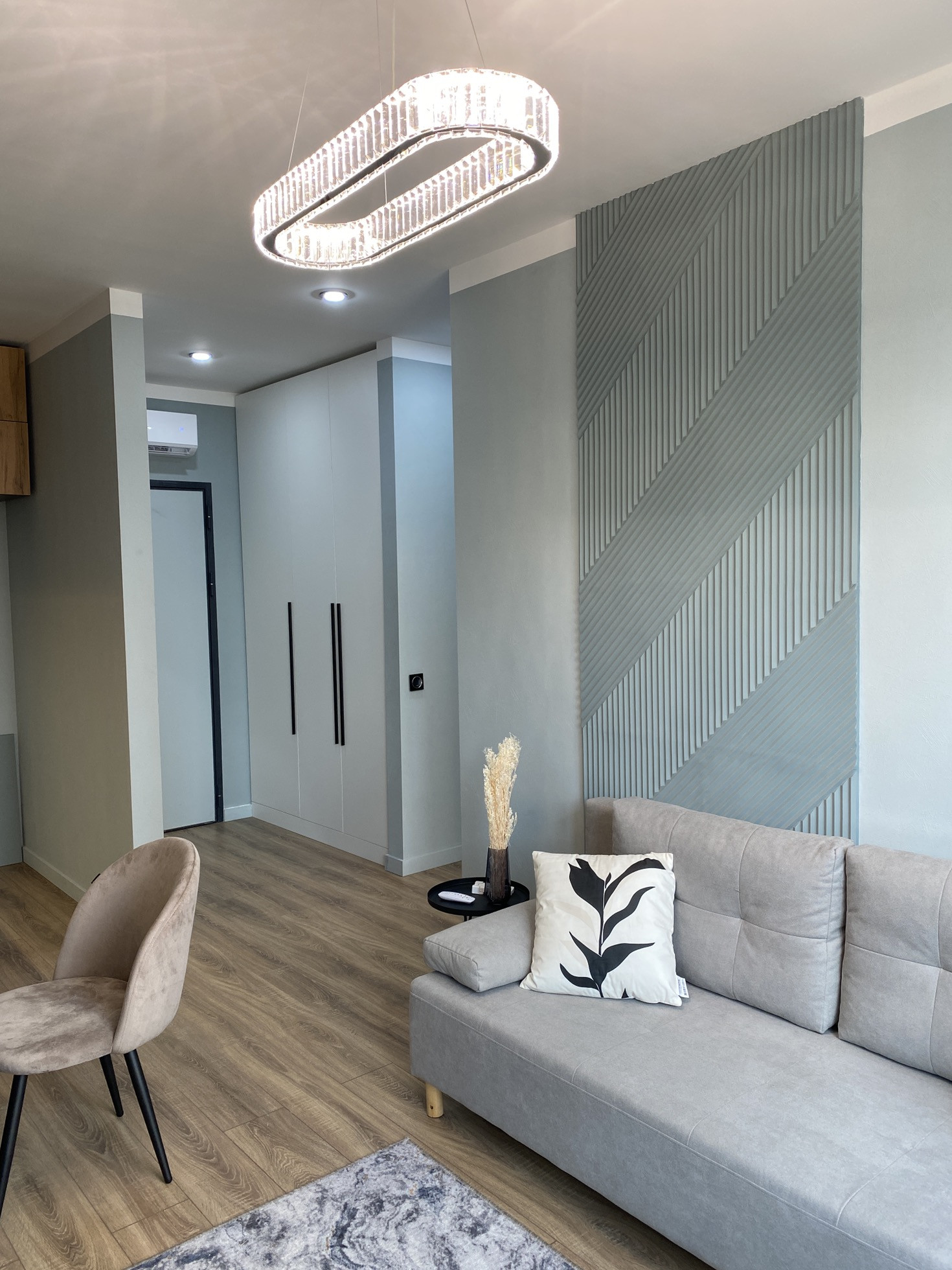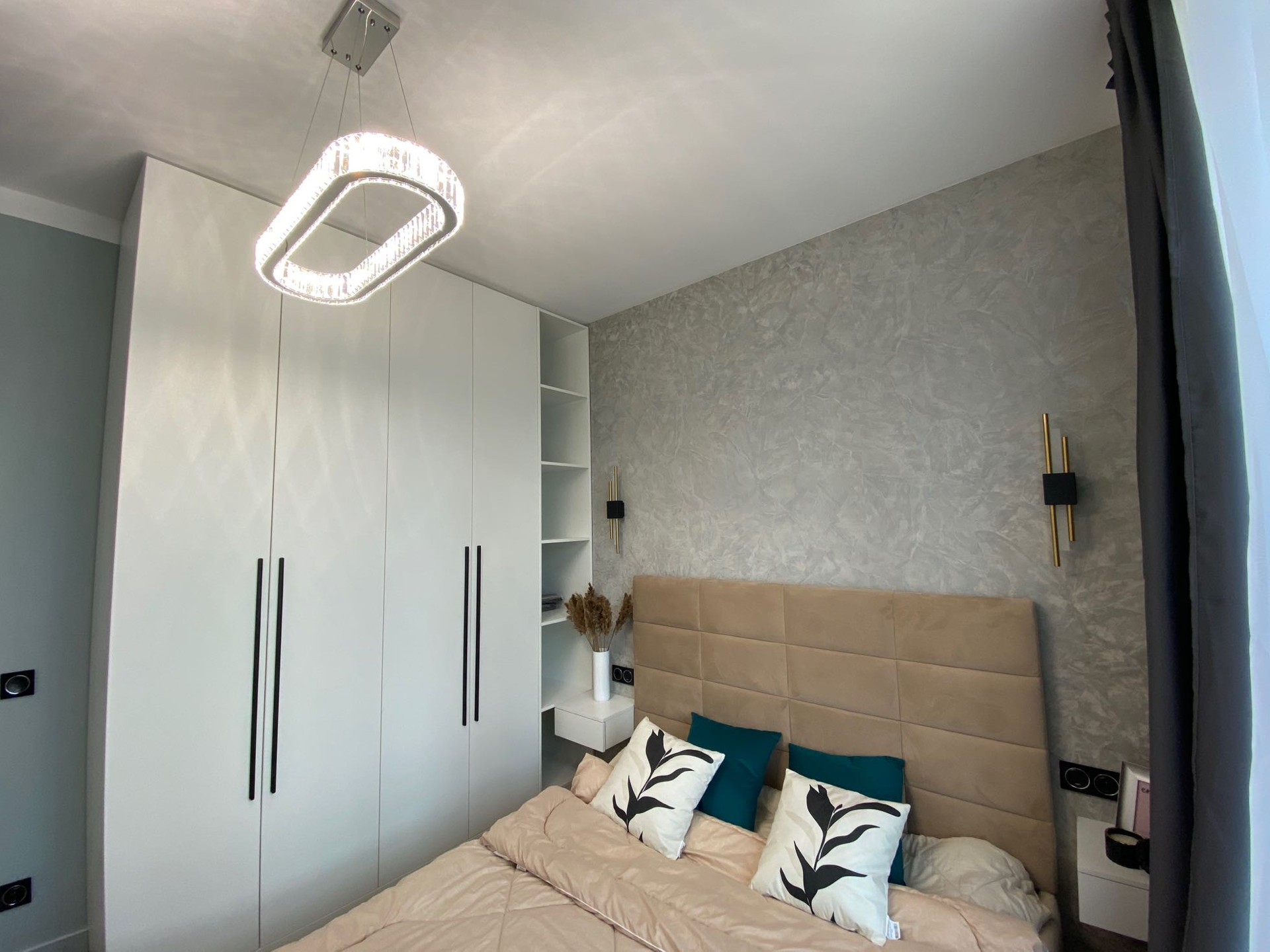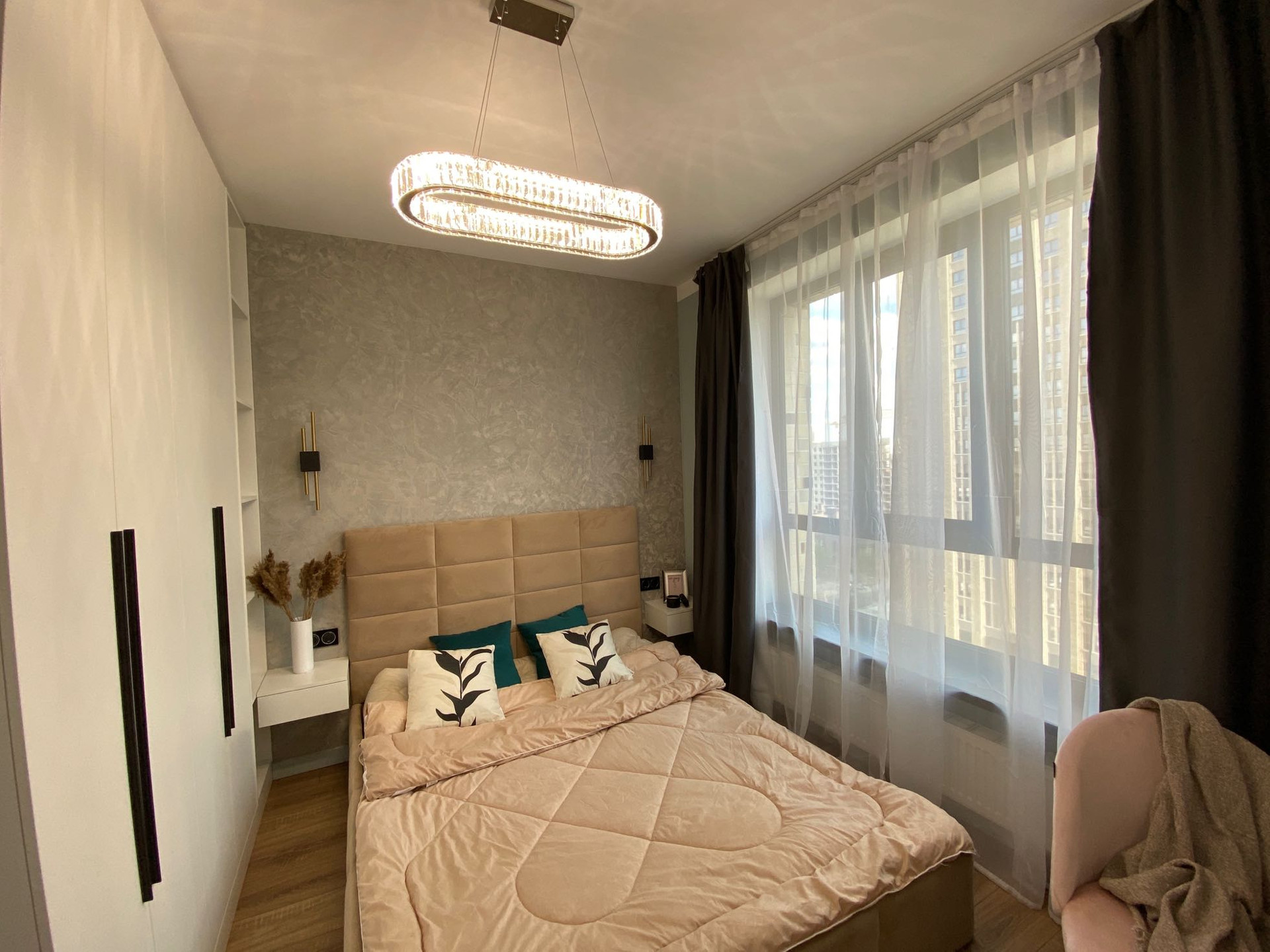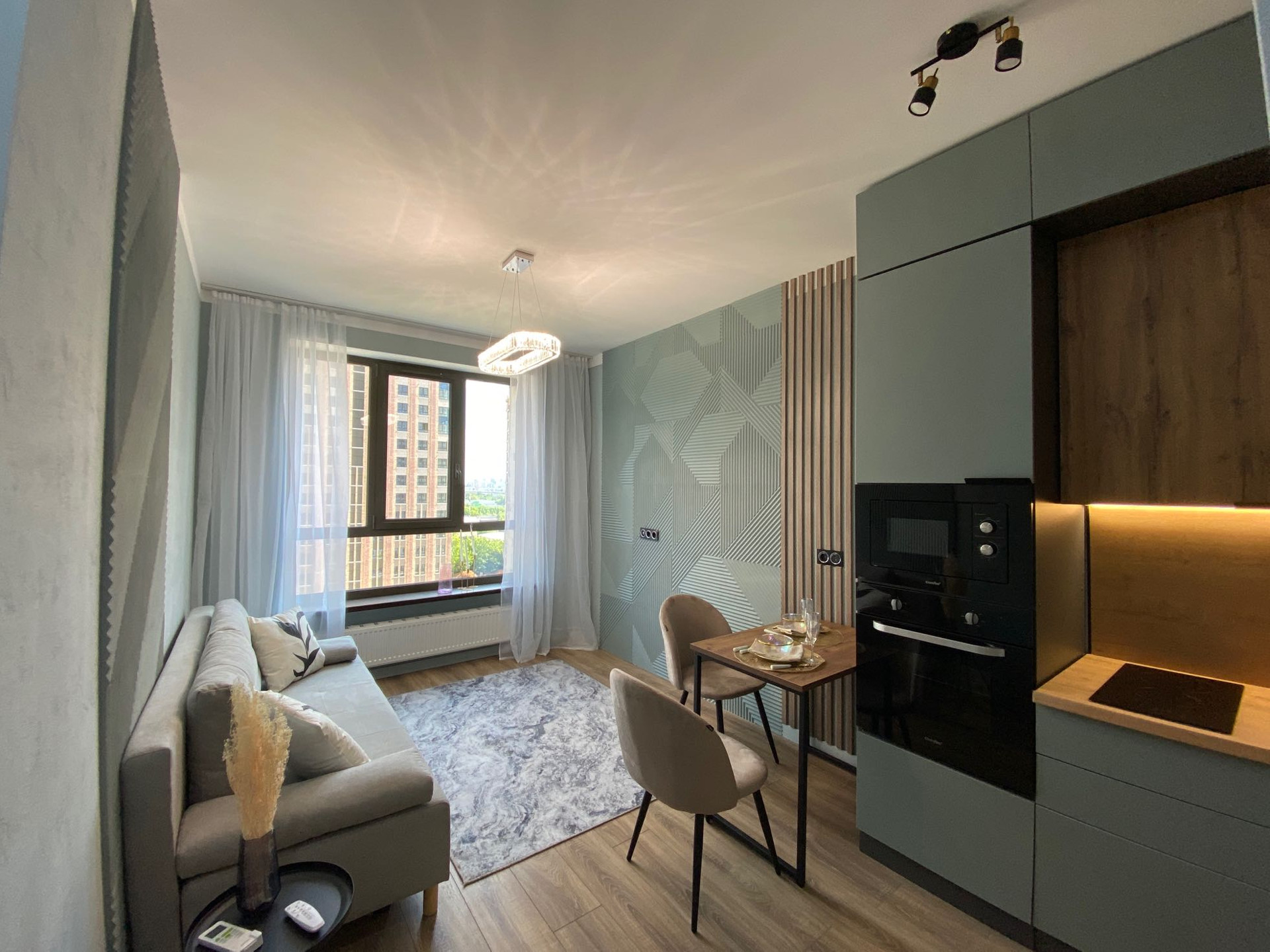 Дизайнерский ремонт от архитектурного бюро, нежные мятные оттенки, стильная черная фурнитура, бесшовные двери, большая спальная комната, вместительная гардеробная система, просторная кухня-гостиная, ванная комната с широкоформатным керамагранитом, система Умный дом, водонагреватель с управлением через Алису, кондиционер, встроенная микроволновая и духовая печь, посудомоечная и стиральная машина, новая дизайнерская кровать, стулья, туалетный столик.