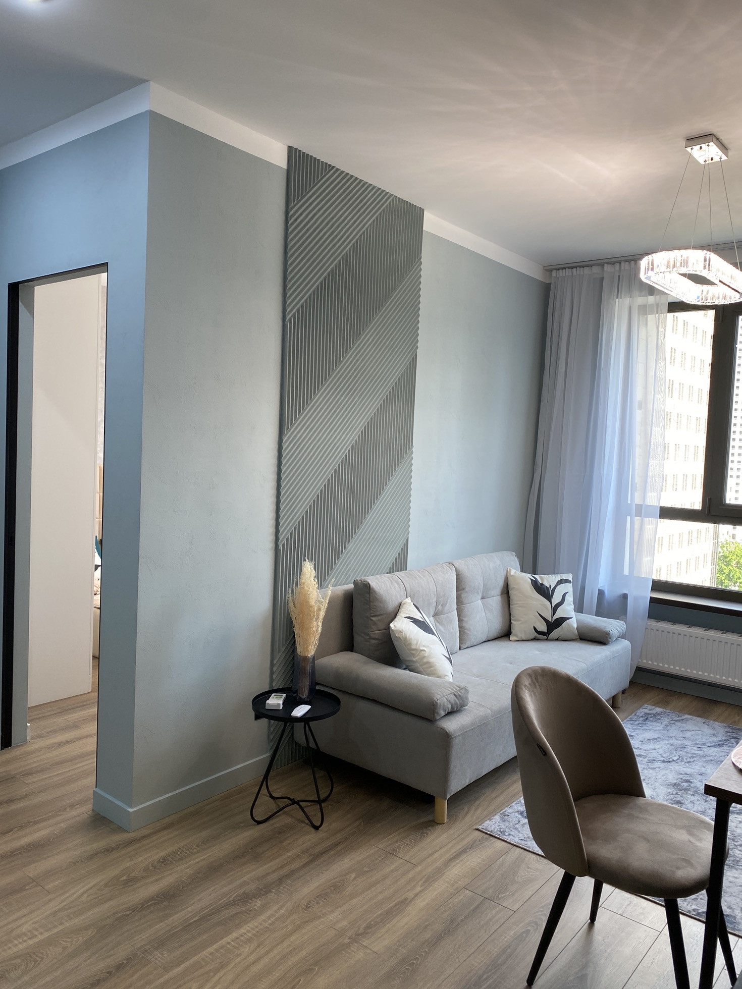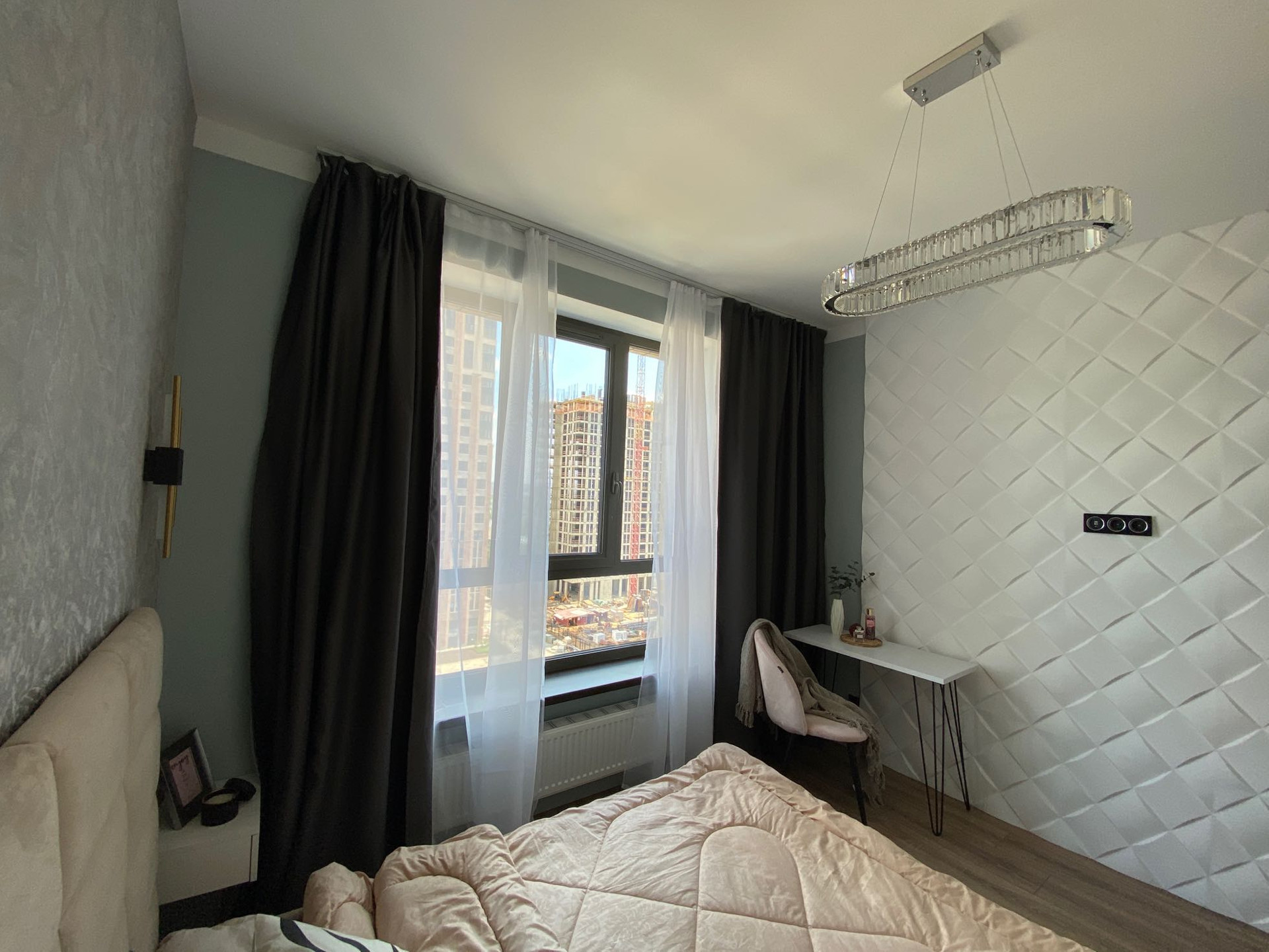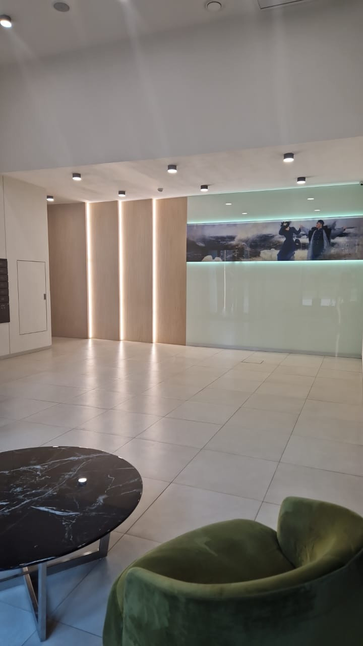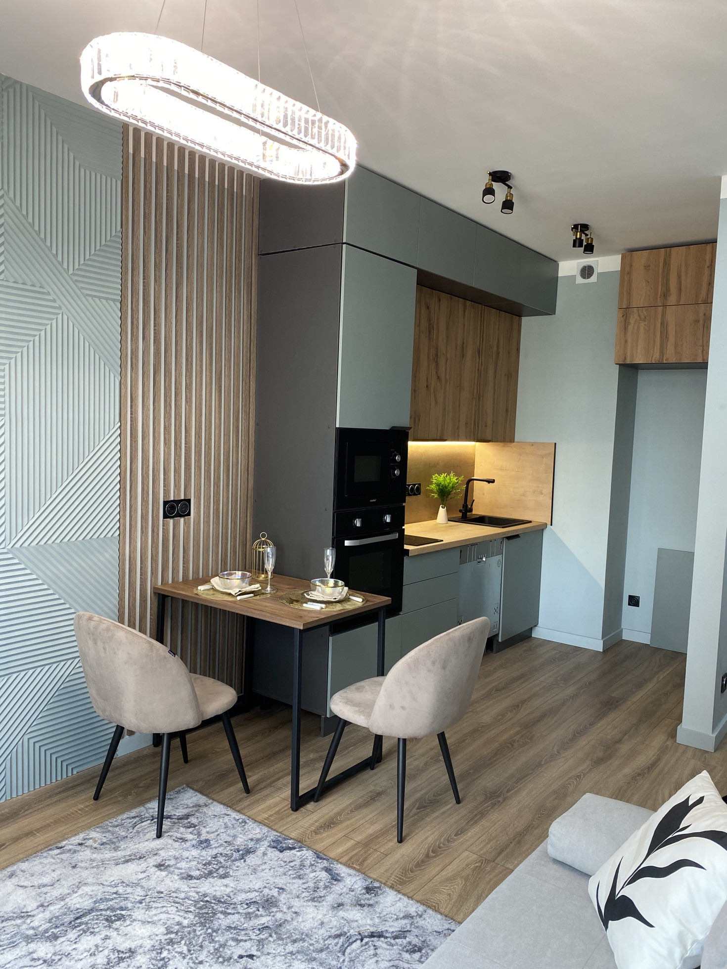 Дизайнерский ремонт от архитектурного бюро, нежные мятные оттенки, стильная черная фурнитура, бесшовные двери, большая спальная комната, вместительная гардеробная система, просторная кухня-гостиная, ванная комната с широкоформатным керамагранитом, система Умный дом, водонагреватель с управлением через Алису, кондиционер, встроенная микроволновая и духовая печь, посудомоечная и стиральная машина, новая дизайнерская кровать, стулья, туалетный столик.