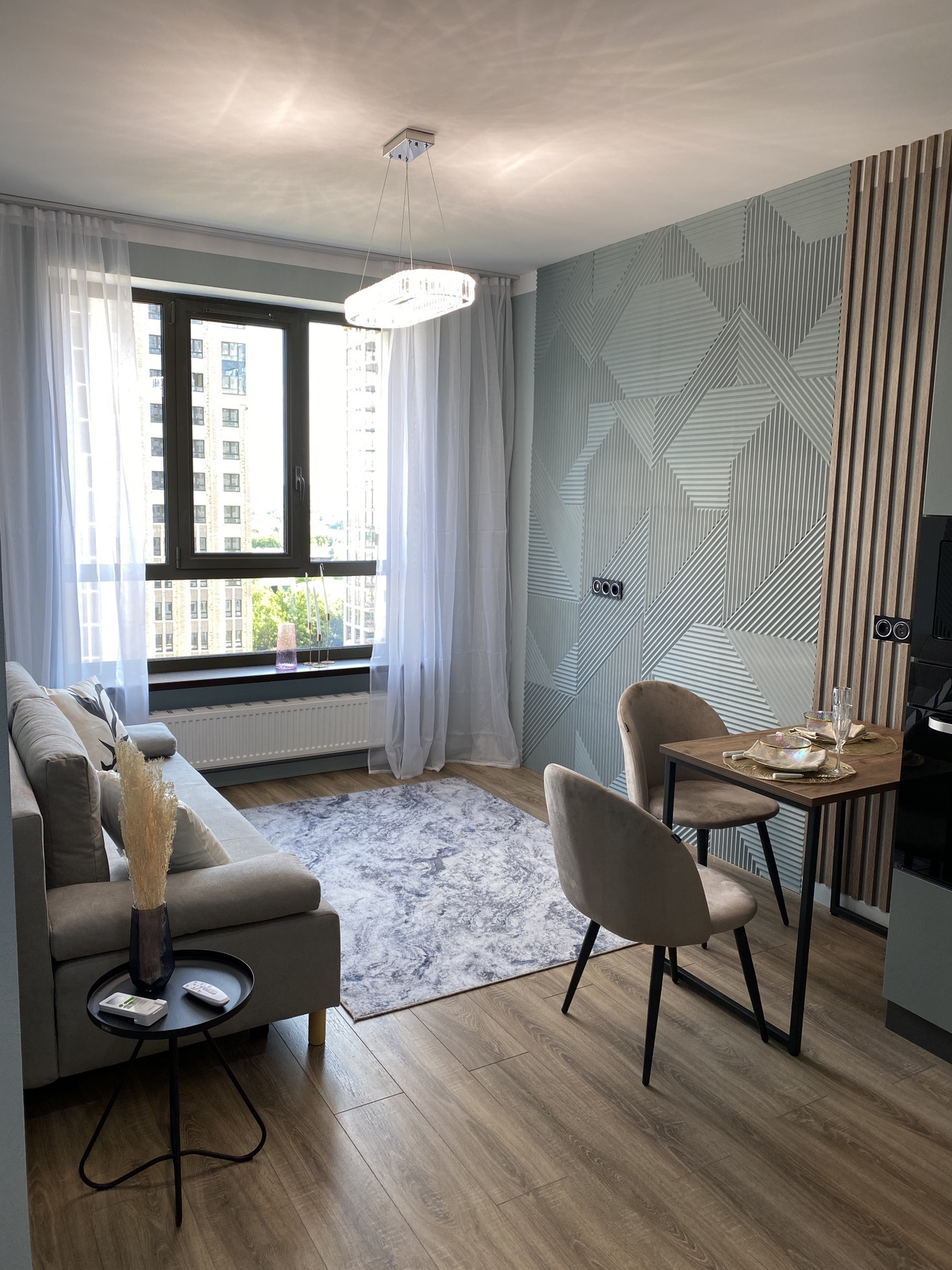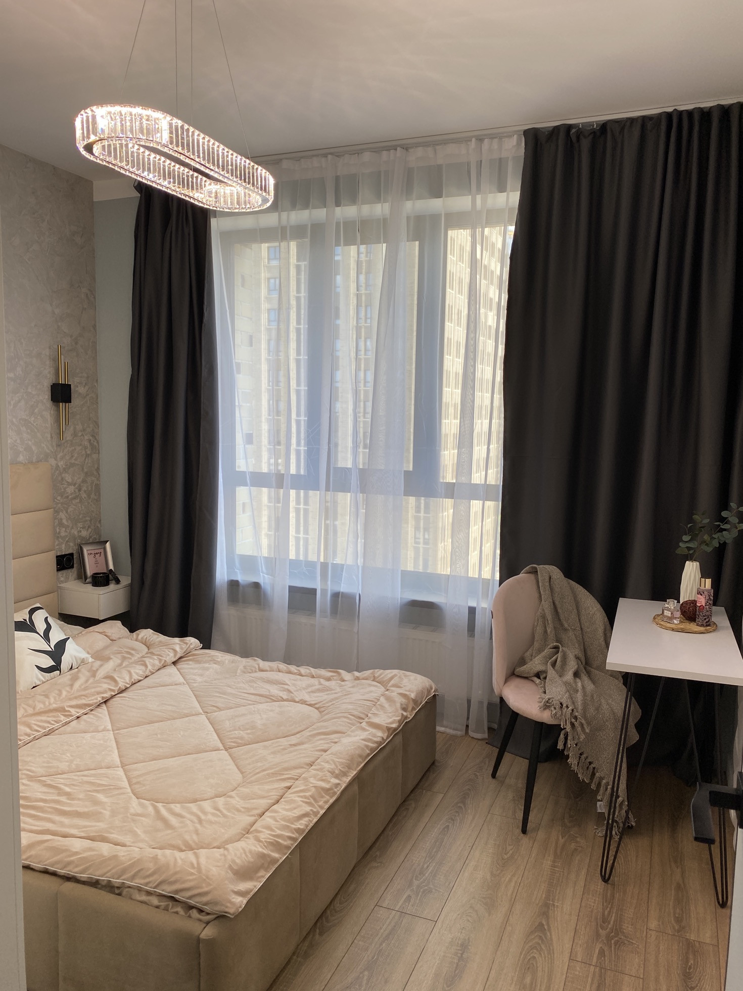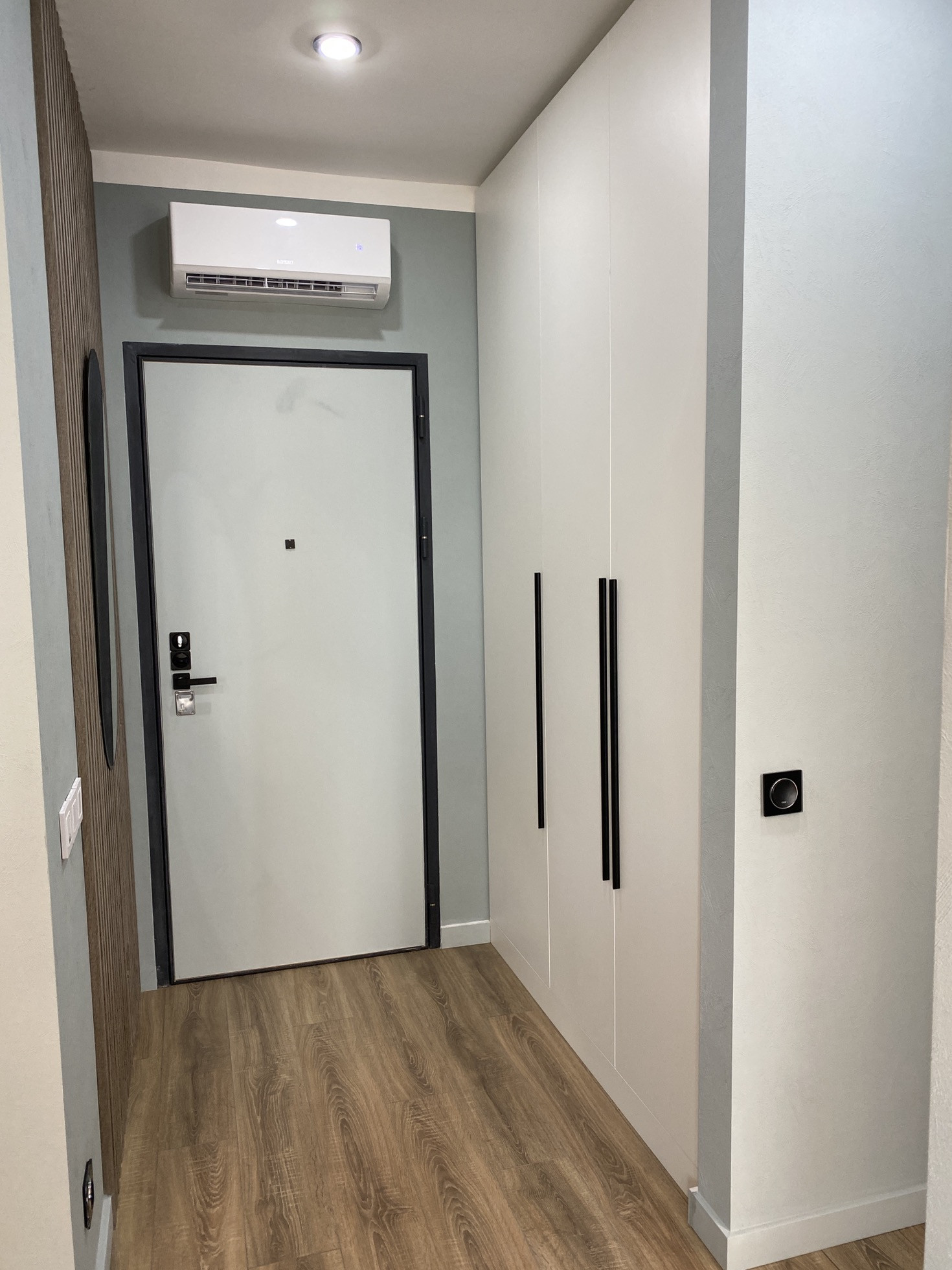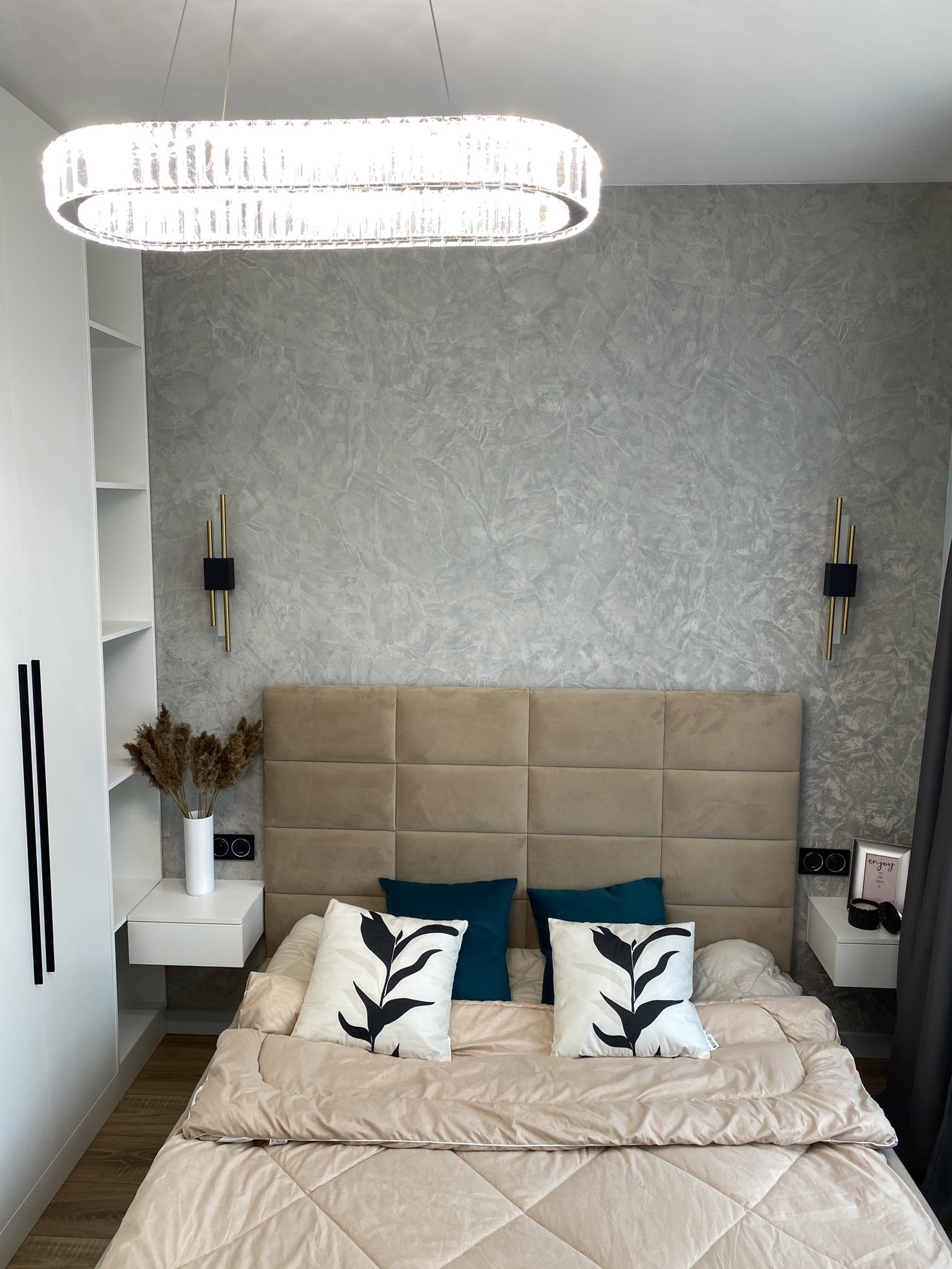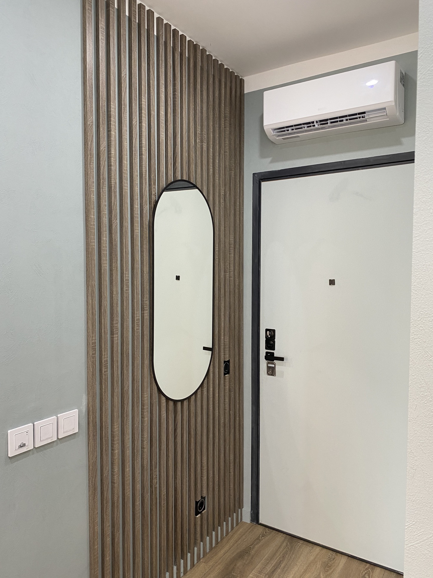 Дизайнерский ремонт от архитектурного бюро, нежные мятные оттенки, стильная черная фурнитура, бесшовные двери, большая спальная комната, вместительная гардеробная система, просторная кухня-гостиная, ванная комната с широкоформатным керамагранитом, система Умный дом, водонагреватель с управлением через Алису, кондиционер, встроенная микроволновая и духовая печь, посудомоечная и стиральная машина, новая дизайнерская кровать, стулья, туалетный столик.