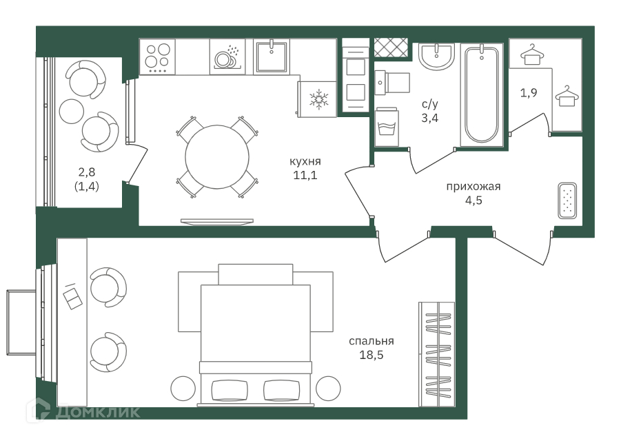 - Просторная спальня - 18.5 кв.м.