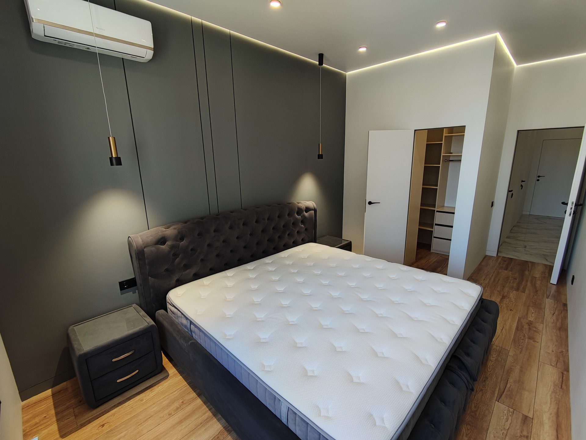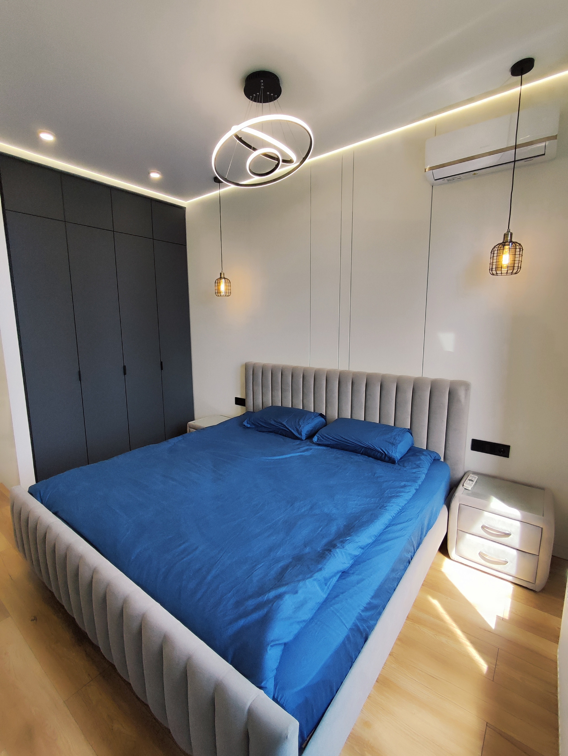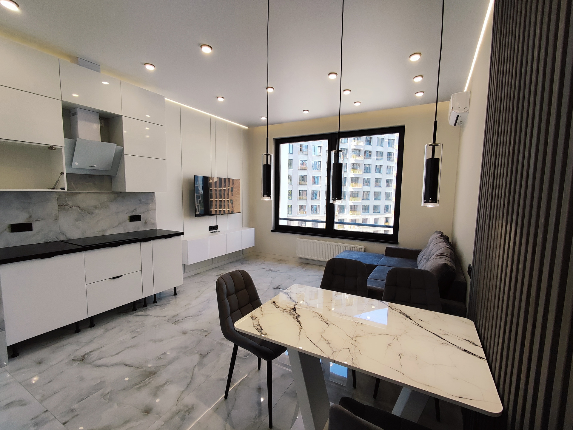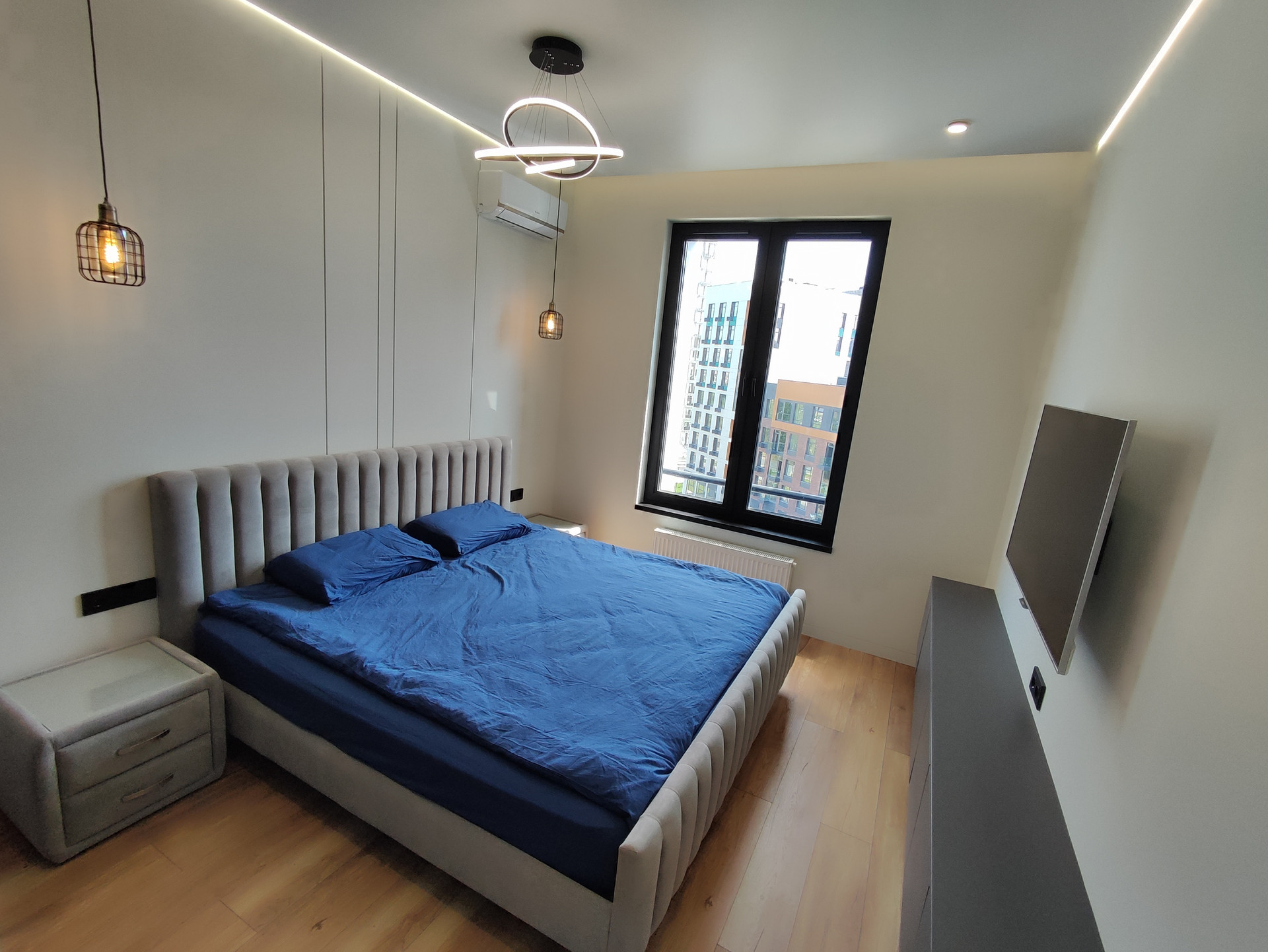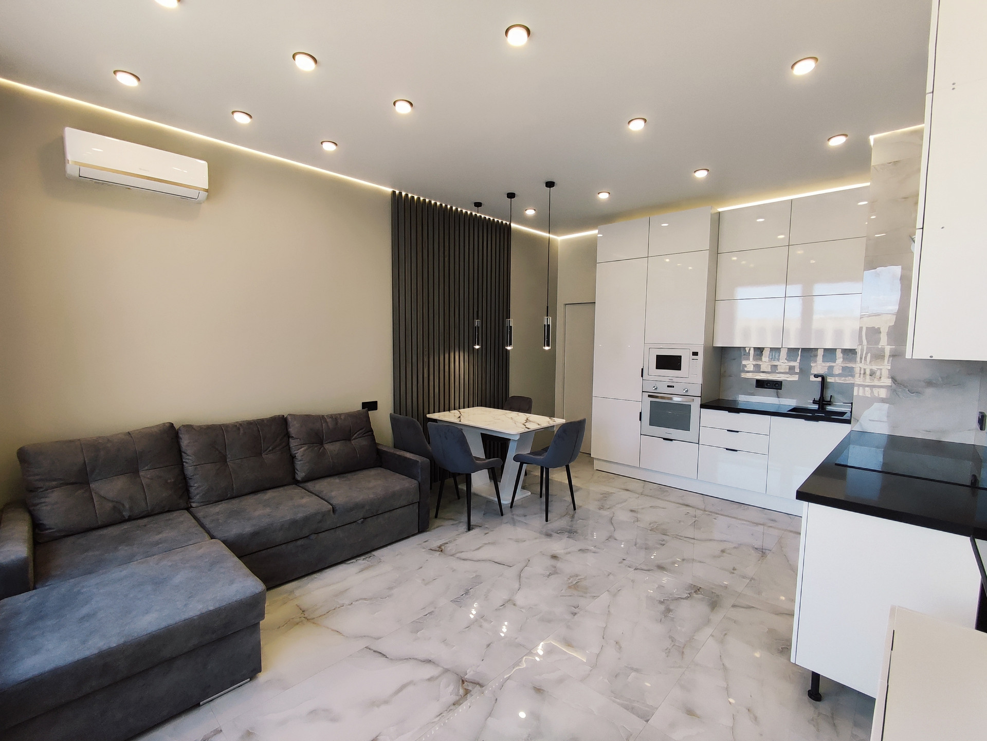 Квартира продается ПОД КЛЮЧ с встраиваемой бытовой техникой и мебелью: встроенный кухонный гарнитур, индукционная плита с вытяжкой, духовой шкаф, СВЧ, холодильник, стиральная машина, встроенный шкаф в прихожей и в спальне, ТВ, двухспальные кровати. В каждой комнате установлен кондиционер.