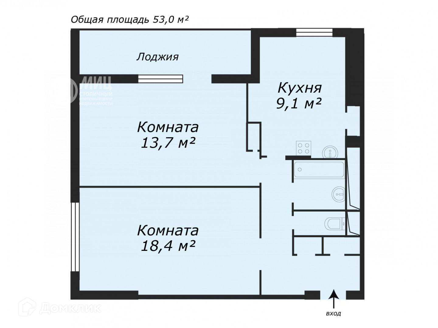 Общая площадь 52.9 м2