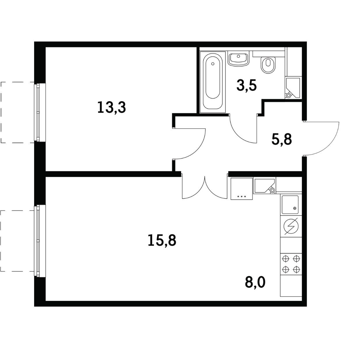 ЕВРОДВУШКА площадью 46.2 м2: просторная кухня-гостиная 24 м2 и изолированная спальня 13.3м2. Благодаря большим окнам квартира буквально пронизана воздухом и светом.