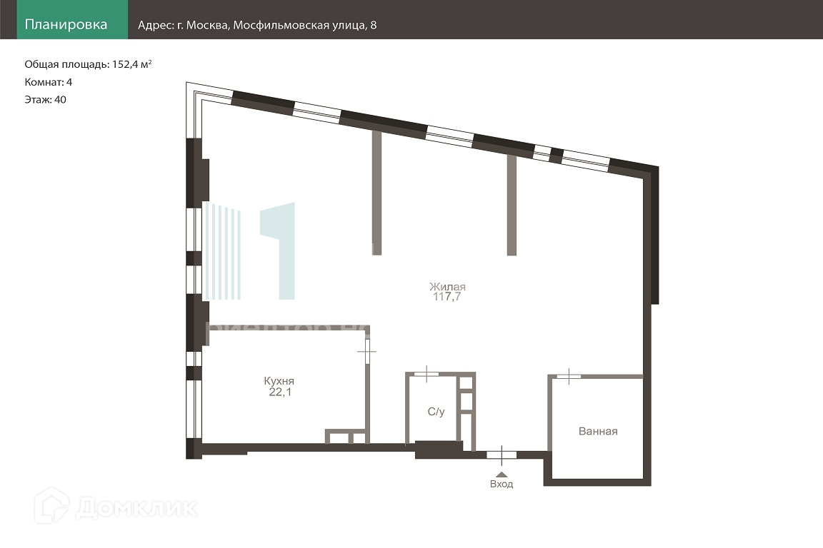 4-комнатная квартира, 152.5 м2, этаж 40 / 43, на продажу в Москве, улица Пырьева, 2