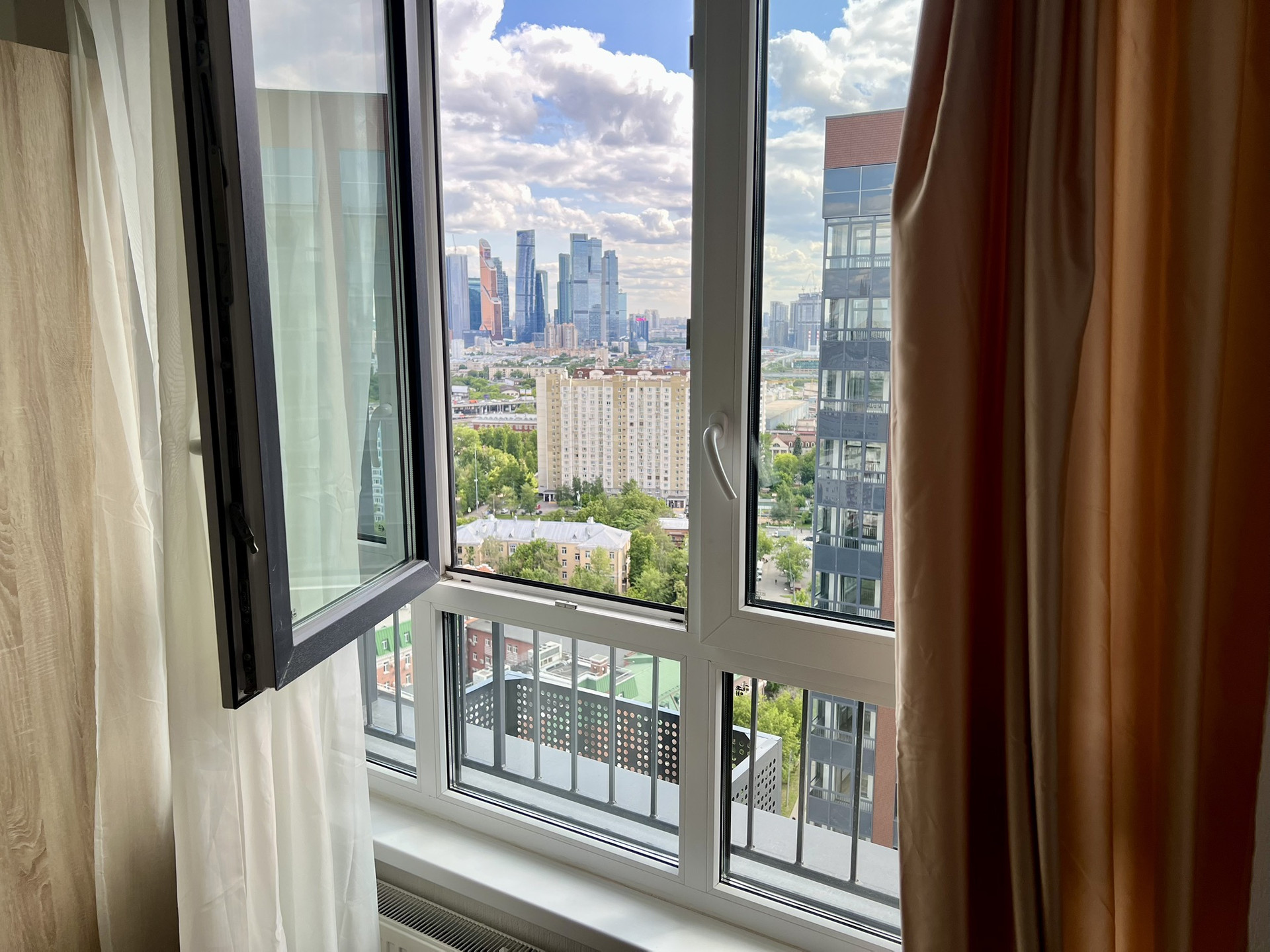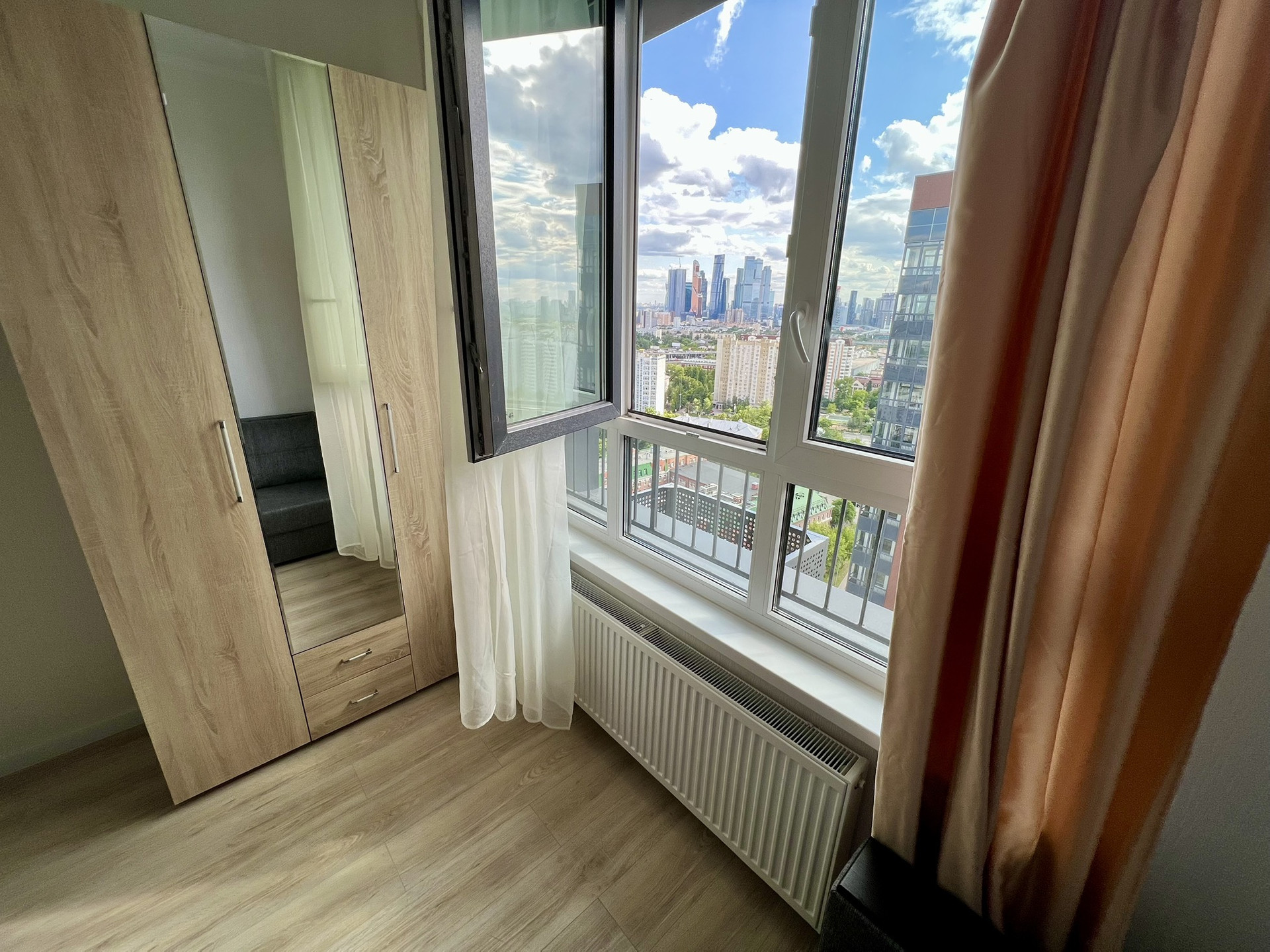 Продается абсолютно новая квартира-студия в ЖК Авиатика с потрясающим панорамным видом на Москву. Наилучшее расположение среди всех студий - соседнее здание находится на достаточно большом расстоянии, вид не окна в окна, а на Москва-сити. Полностью мебелирована, готова к заезду жильцов. До метро Беговая 9 минут пешком. Есть подземный паркинг, кладовые на каждом этаже. Один взрослый собственник, свободная продажа.