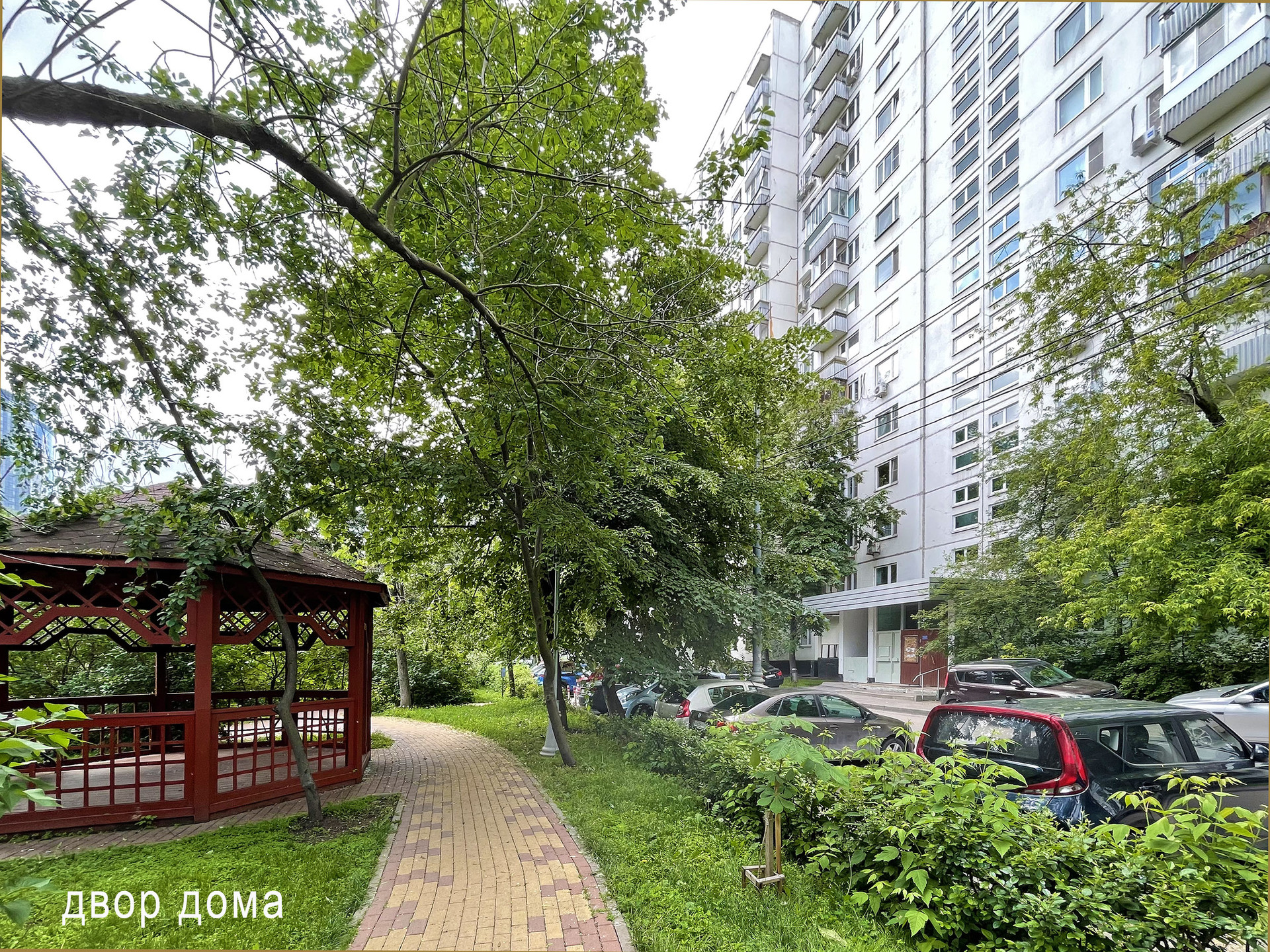 Большой зеленый двор закрыт шлагбаумом, есть охраняемая парковка.