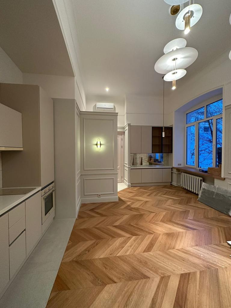 В квартире полы, плитка, паркет; высокие потолки- 4.2 м,, большие окна выходят в тихий уютный двор.