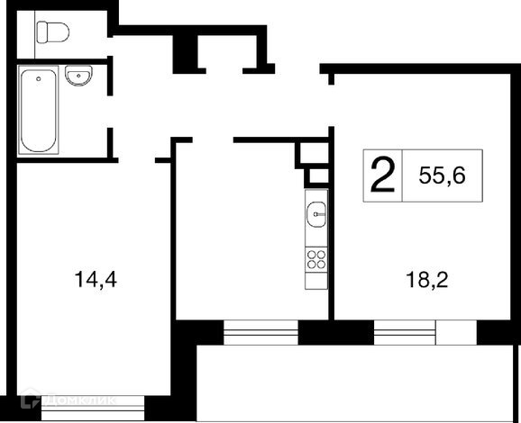 Общая площадь 55,6 м2, жилая 32,6 м2, комнаты, изолированные 18,2 м2 + 14,4м2, площадь кухни – 10,2м2, просторная лоджия 6м2.