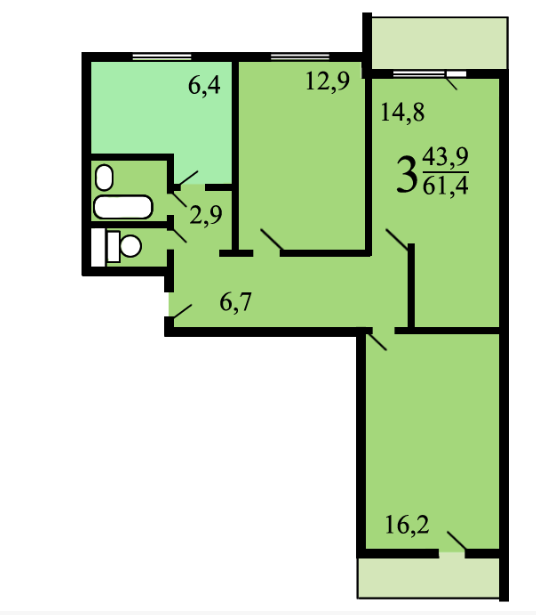 Общая площадь 61.4 м2