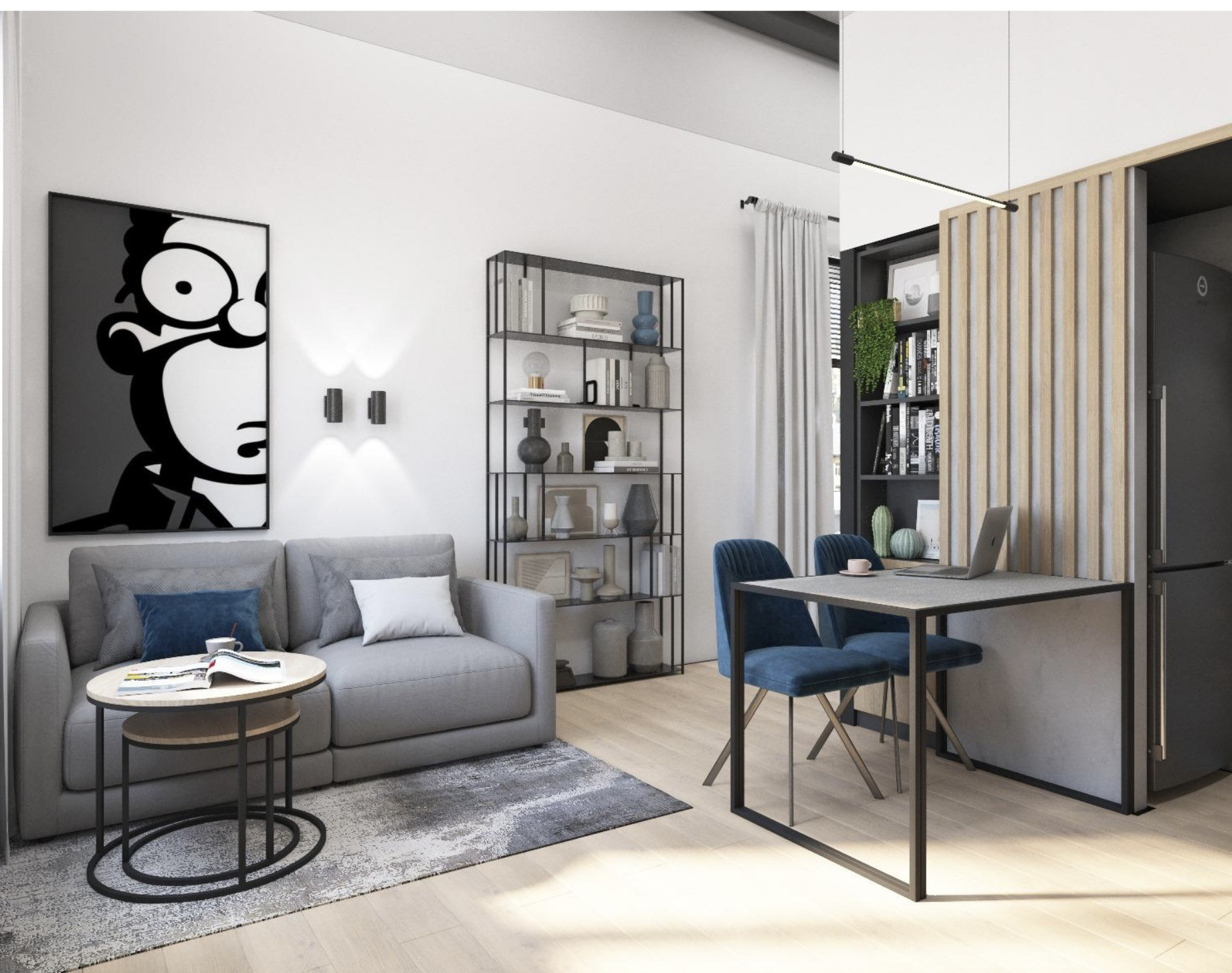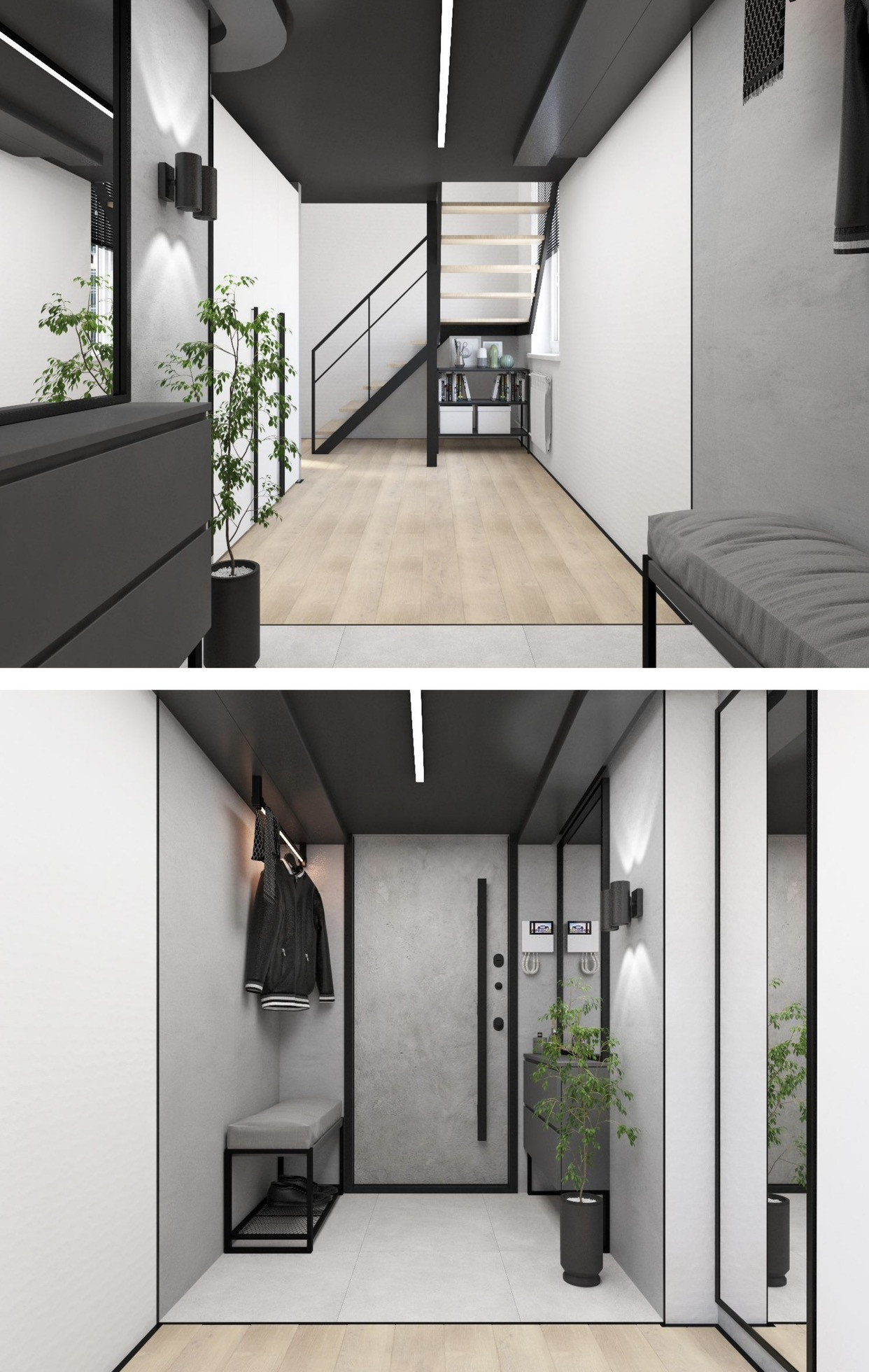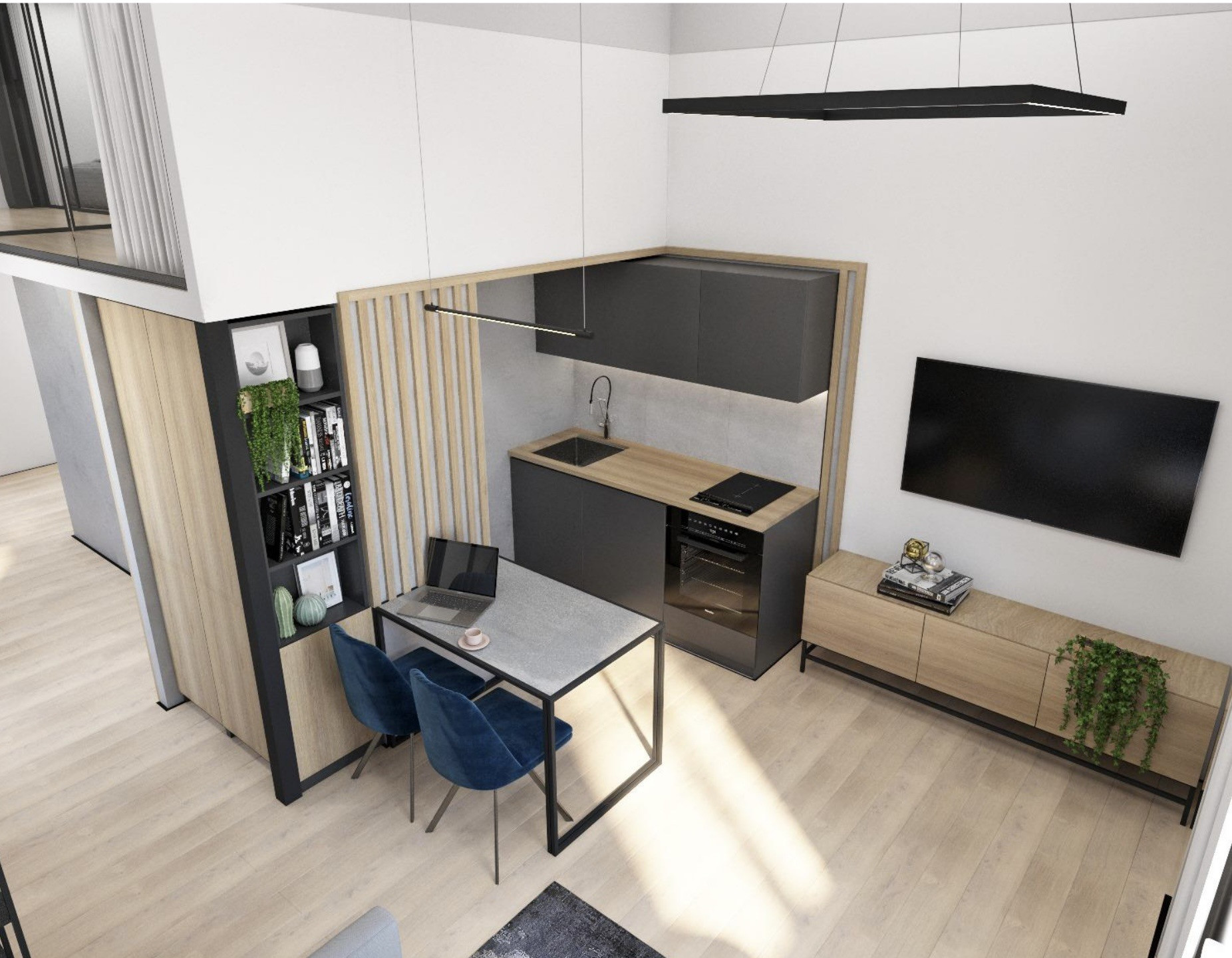 Апартамент двухуровневый, на первом этаже 37,4 метра, где располагается санузел, кухня-гостиная и на втором этаже 2 небольшие спальни, можно сказать что апартамент трехкомнатный.