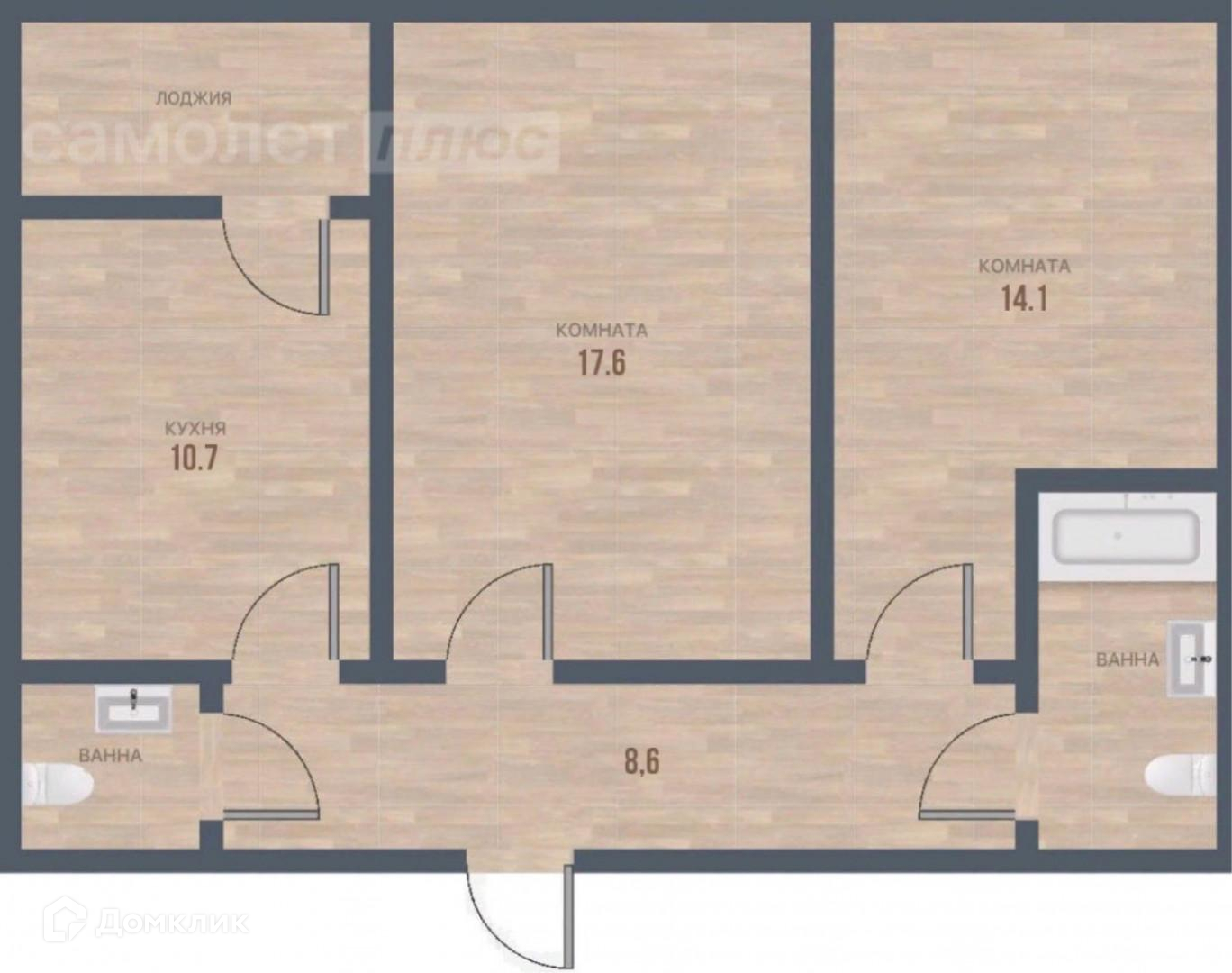 Площадь квартиры - 56,6 м². Кухня - 10,7 м². Комната - 17.6 м². Комната - 10.7 м².
