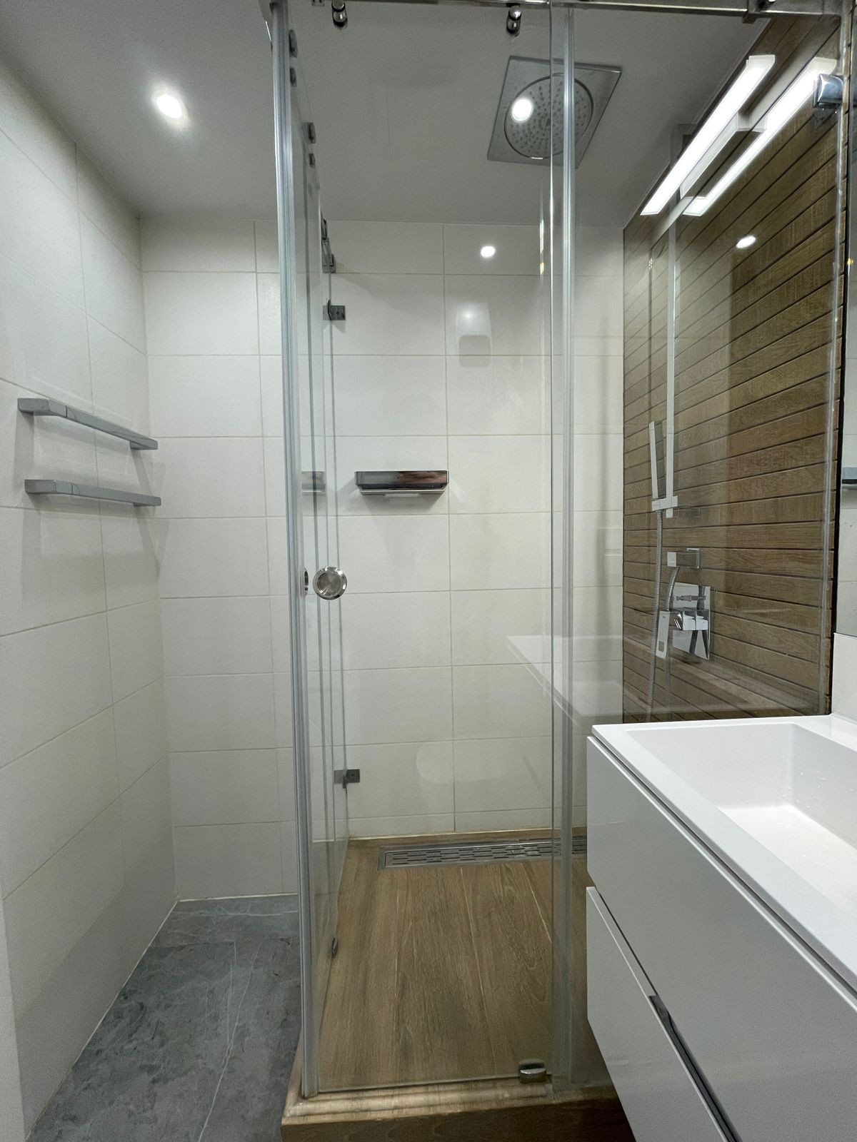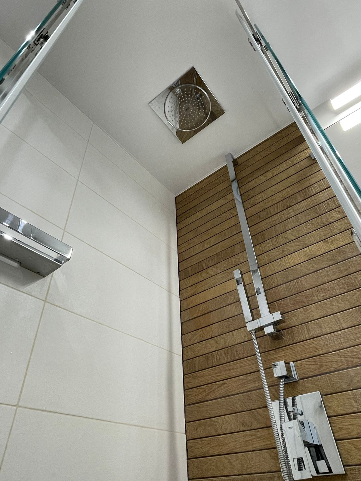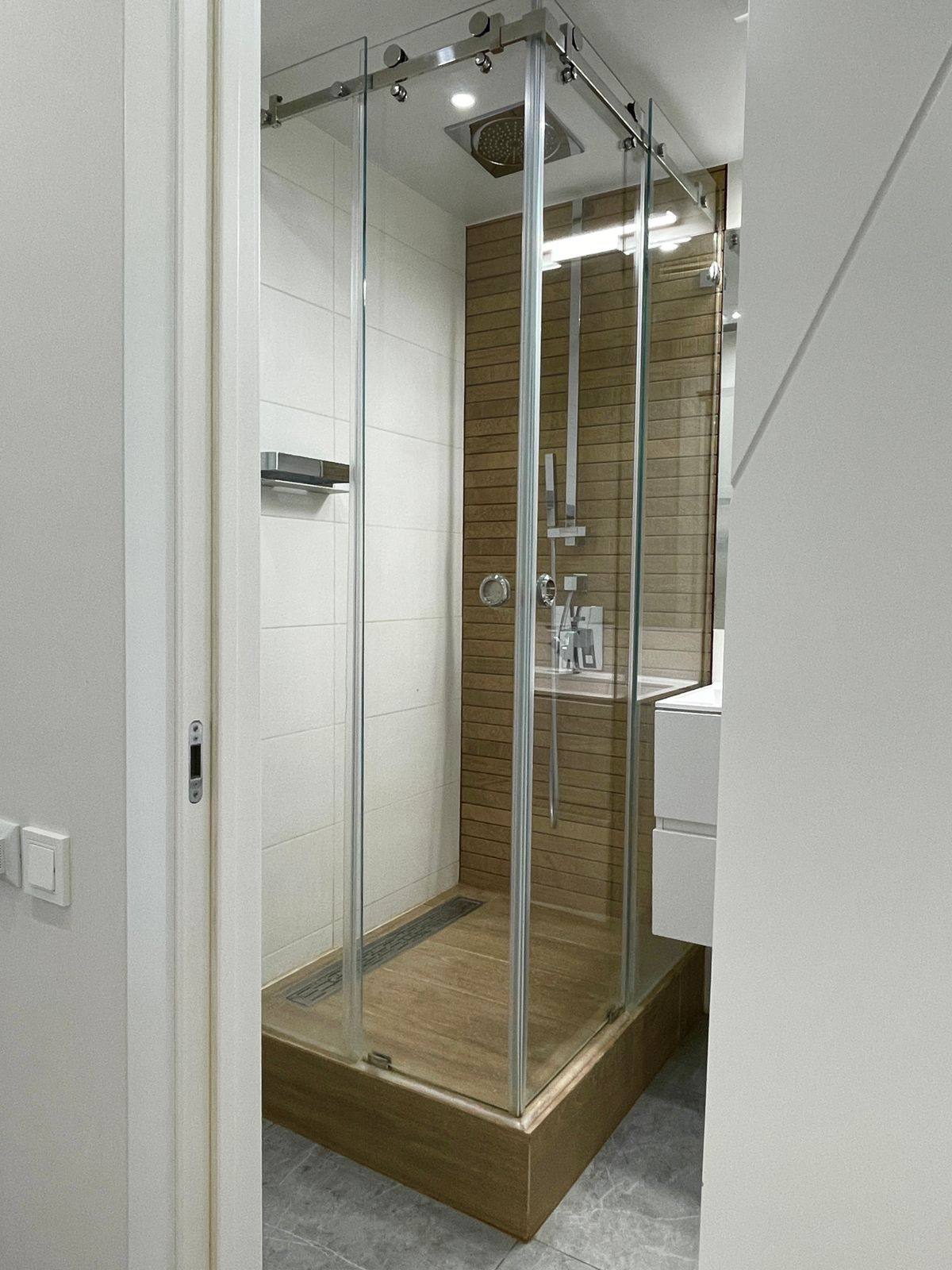 Ремонт выполнен с использованием высококачественных материалов, стены окрашены, пол - ламинат, теплый пол в прихожей и в санузле, потолки натяжные, окна пластик, в санузле сантехника Grohe, разводка по гребенкам, инсталляция, встроенная душевая с тропическим душем в потолке, лоджия остеклена и обустроена.