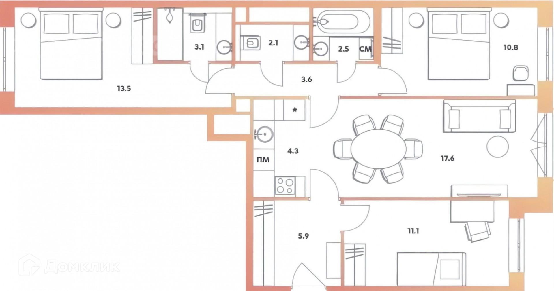 Площадь квартиры - 75 м². Кухня-гостиная - 17.6 м². Комната - 13.5 м². Комната - 10.8 м². Комната - 11.1 м².