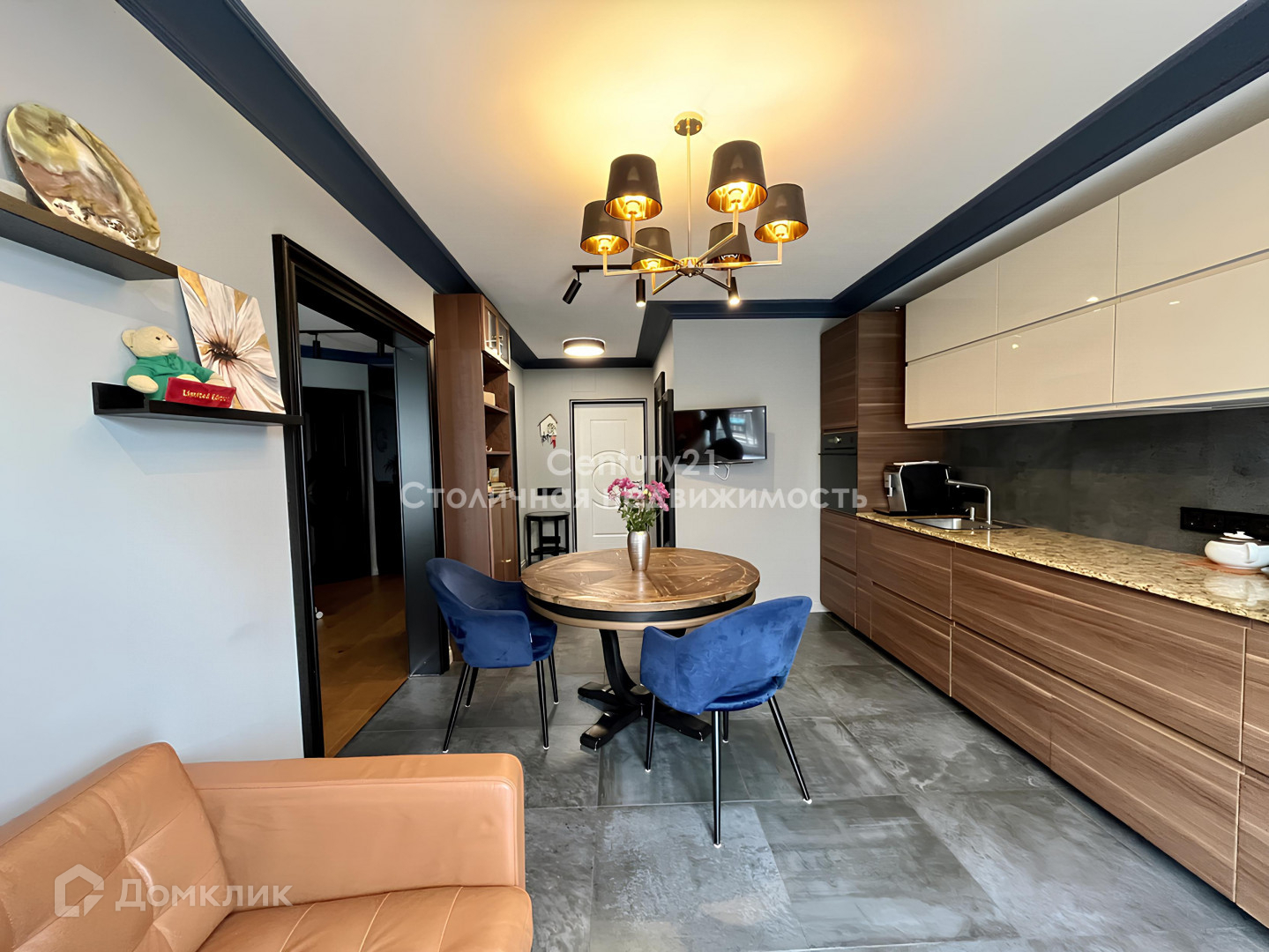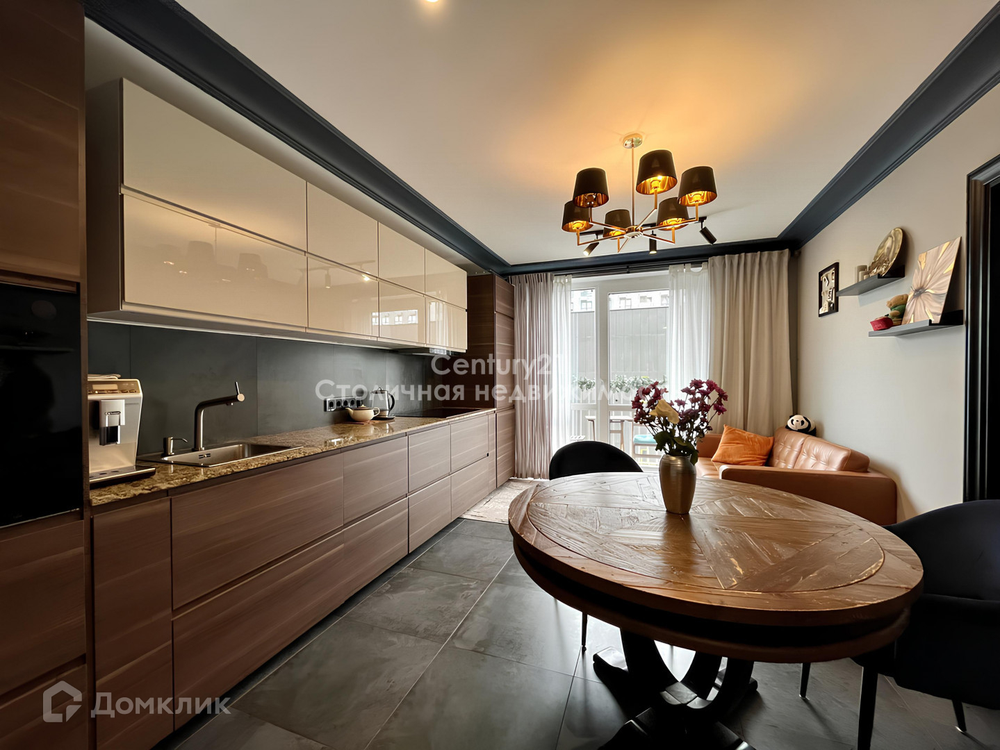 Просторная кухня-столовая 15,3 кв.м с обеденной зоной и зоной отдыха с кожаным диваном