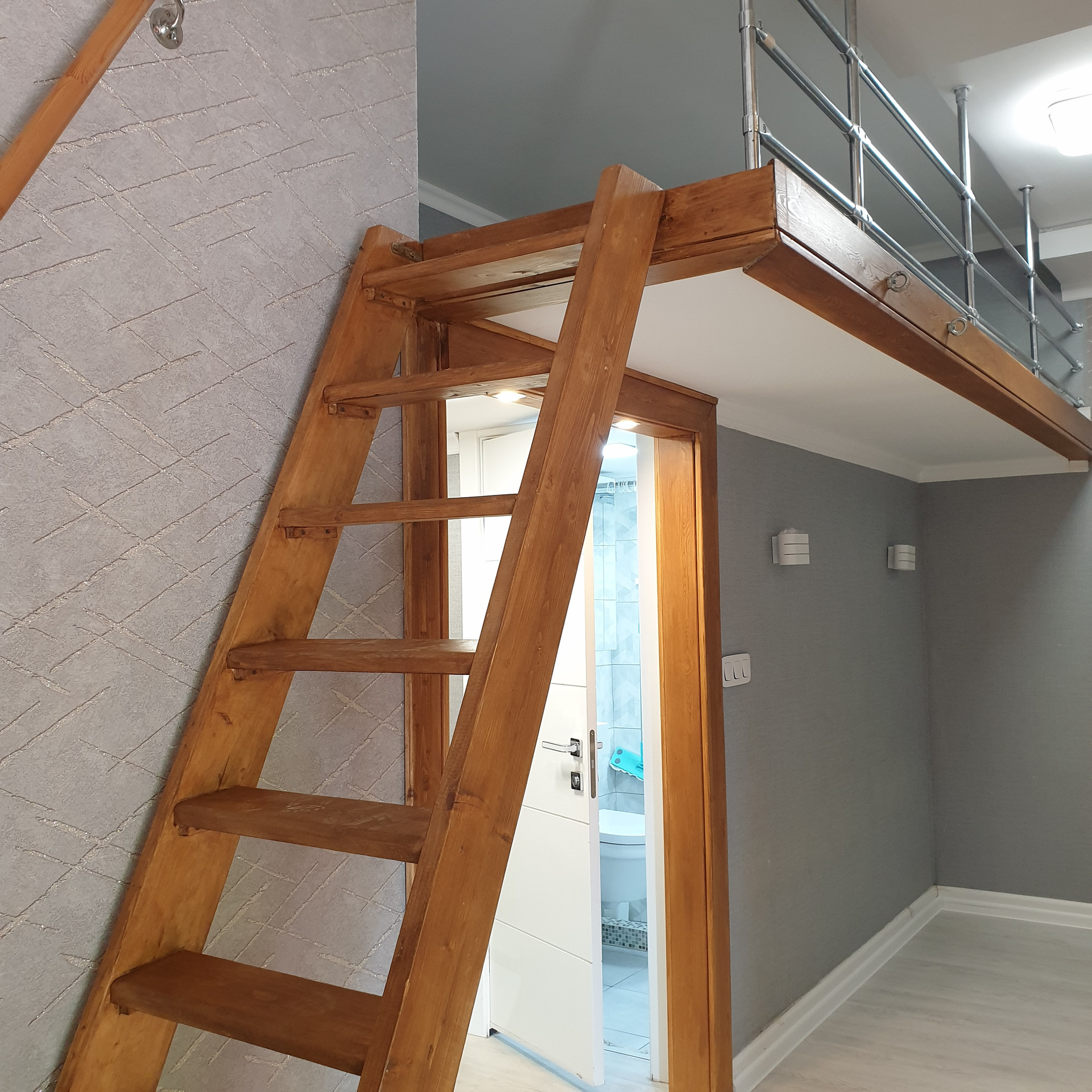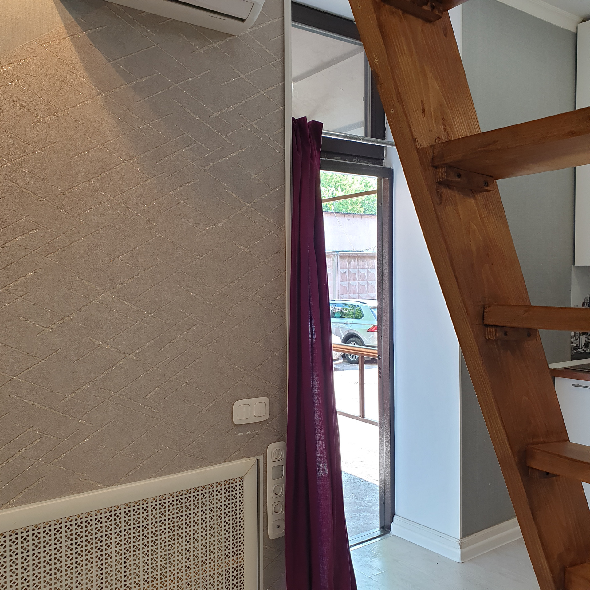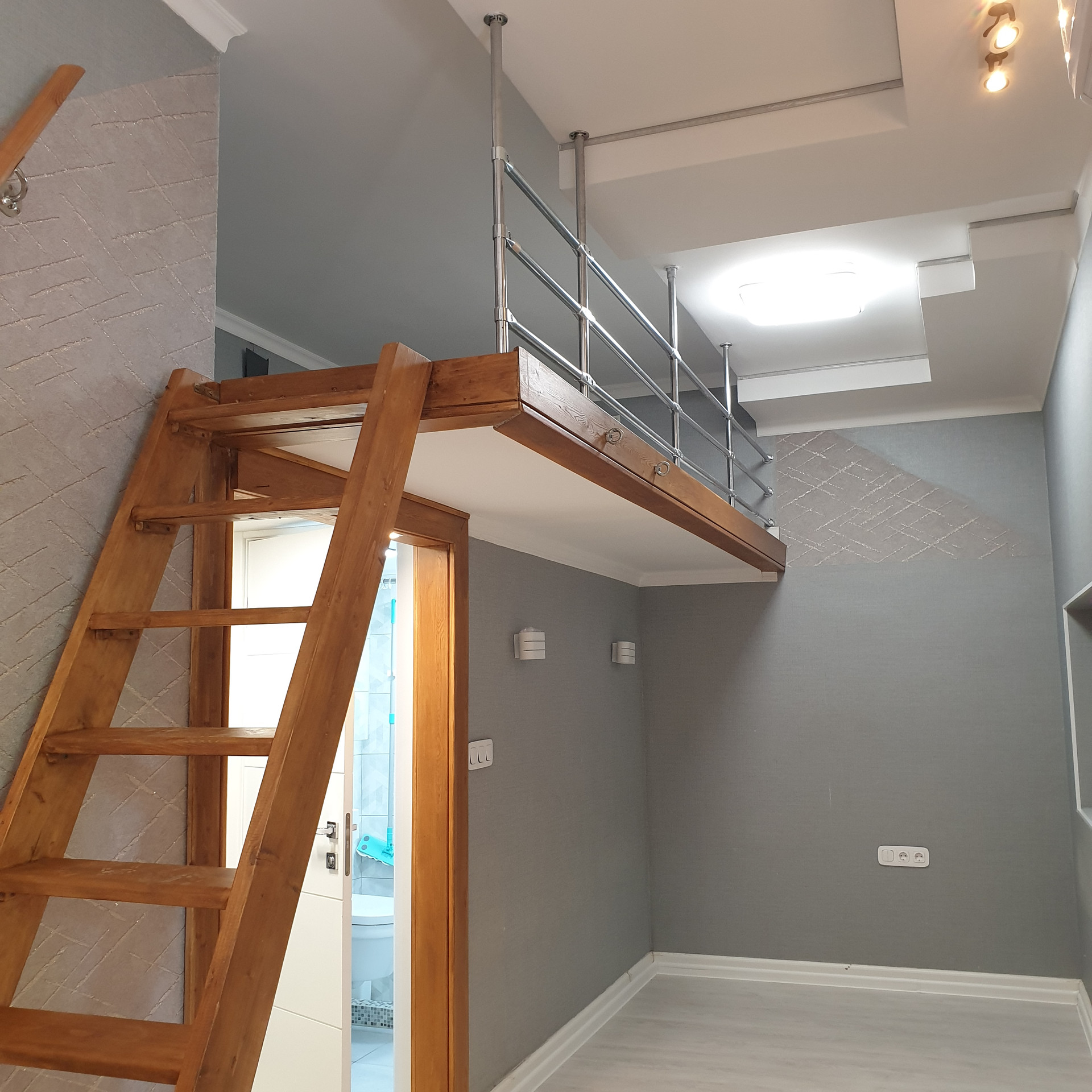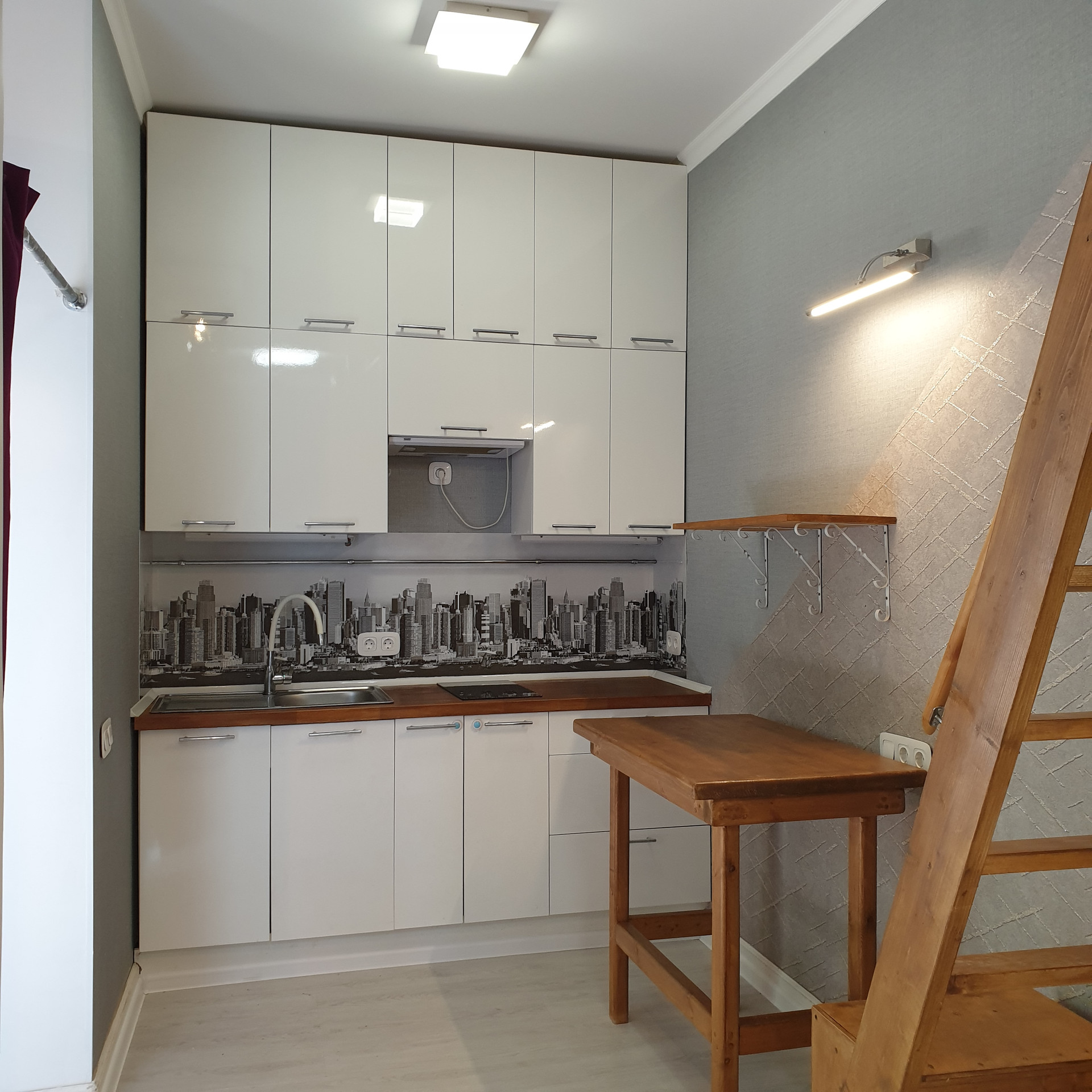 Студия с евроремонтом, готовая к проживанию. Вход в помещение из общего коридора и со двора, работает общедомовая вытяжная вентиляция воздуха и своя индивидуальная. Есть кондиционер. Высокие потолки около 4-х метров, есть антресоль - спальное место. Встроенная кухня с электрической варочной панелью. Сан/узел совмещенный, в плитке, с поддоном для душа. Есть кладовая для вещей. Теплые полы.