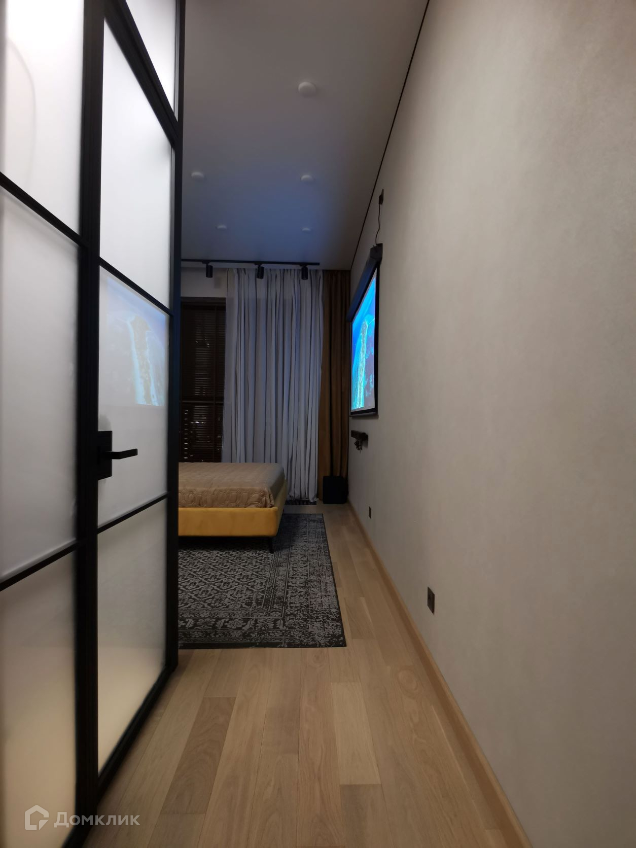 - в спальне смарт-проектор, экран 85 дюймов, аудио система с сабом, доп. звукоизоляция.