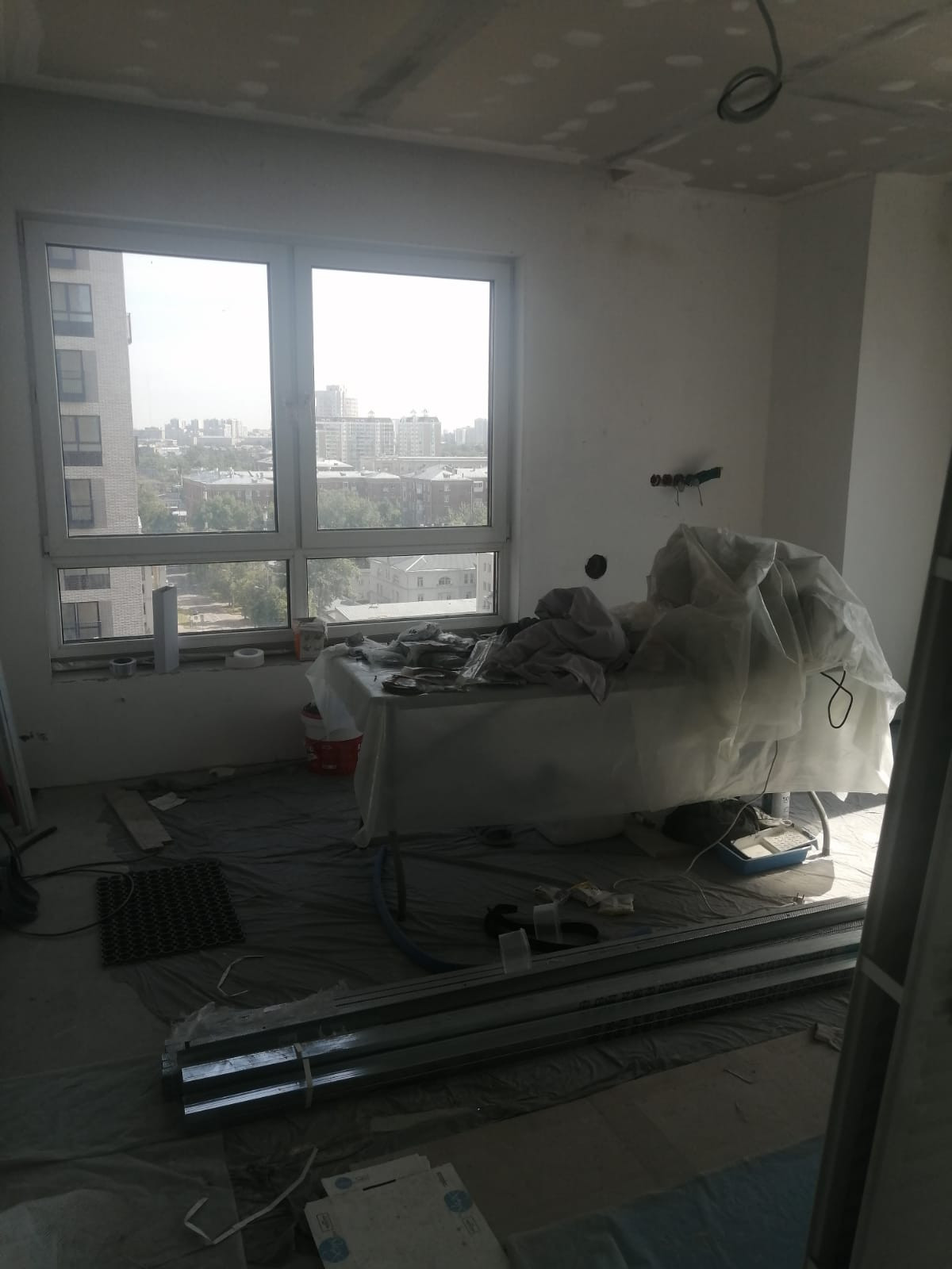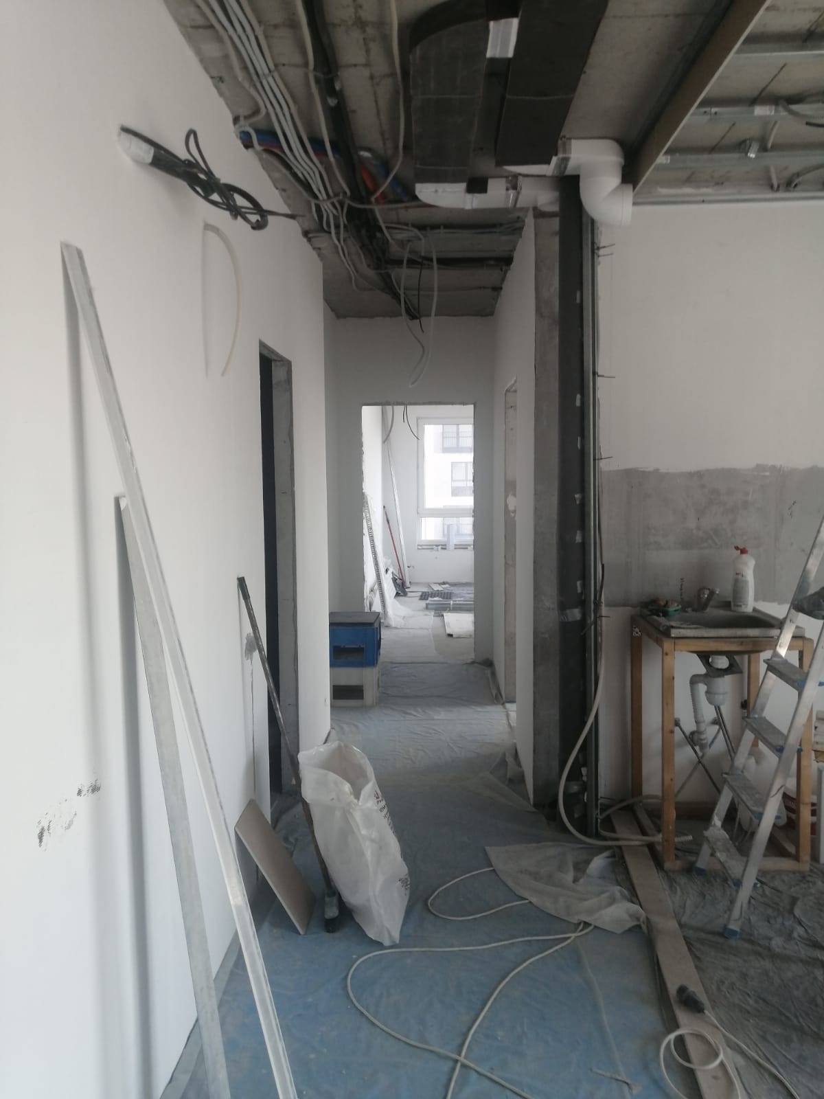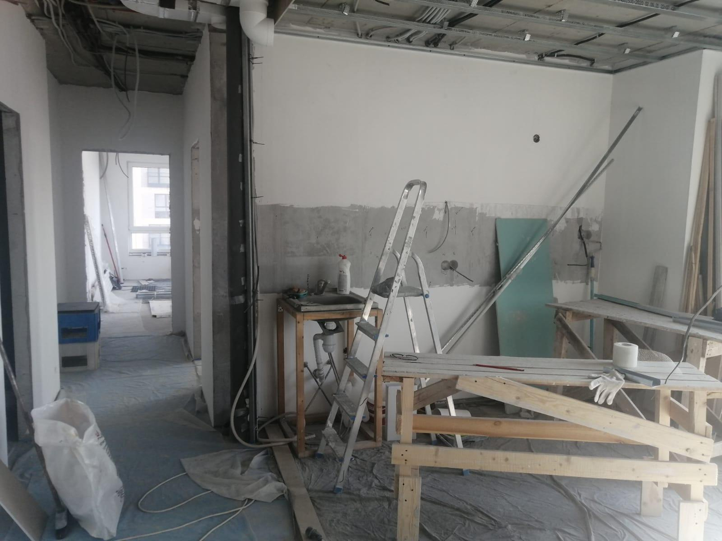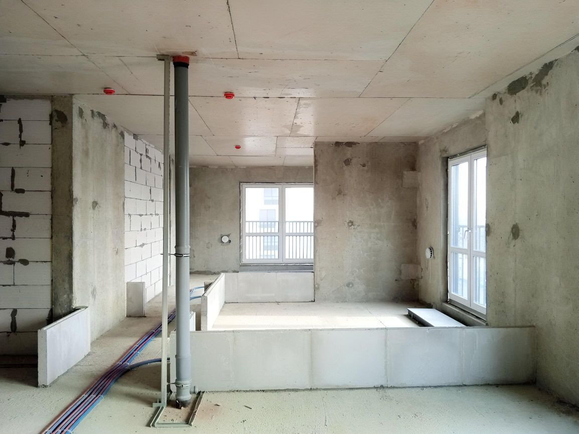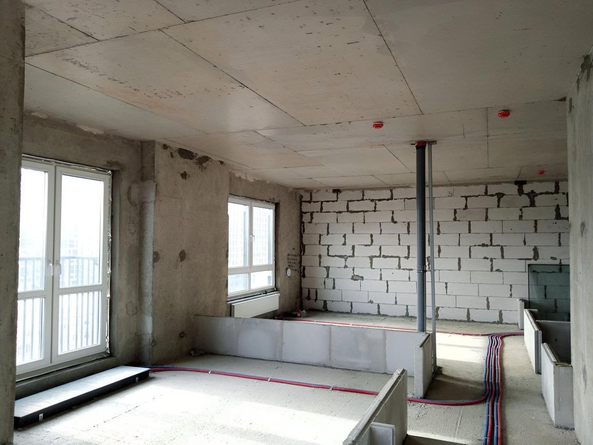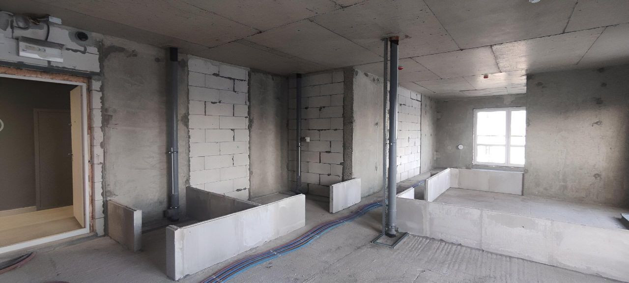 В квартире произведены следующие работы : возведены стены ,штукатурка, шпатлевка 1 слой ,разводка воды , разводка электрики , разводка систем кондиционирования VRF , наливной пол , потолок гипсокартон , откосы ,санузел штукатурка пескобетон.