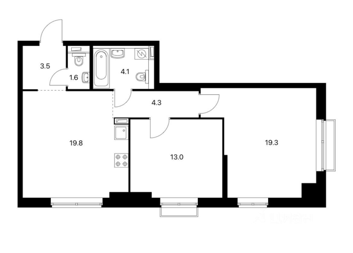 Вашему вниманию предлагается просторная двухкомнатная квартира с предчистовой отделкой. Кухня-гостиная 19.8 кв.м., две изолированные комнаты 19.3 кв.м. и 13 кв.м. , два санузла.