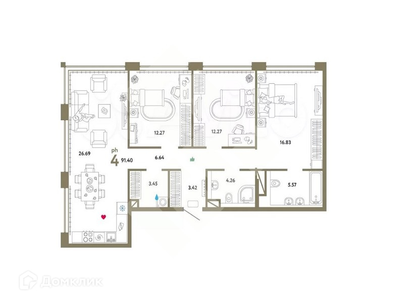 Планировка квартиры представляет собой  четыре спальни, кухню., два санузла, две лоджии, две гардеробные. Корпус состоит всего из 13 этажей. На территории комплекса имеется своя приватная территория для отдыха.