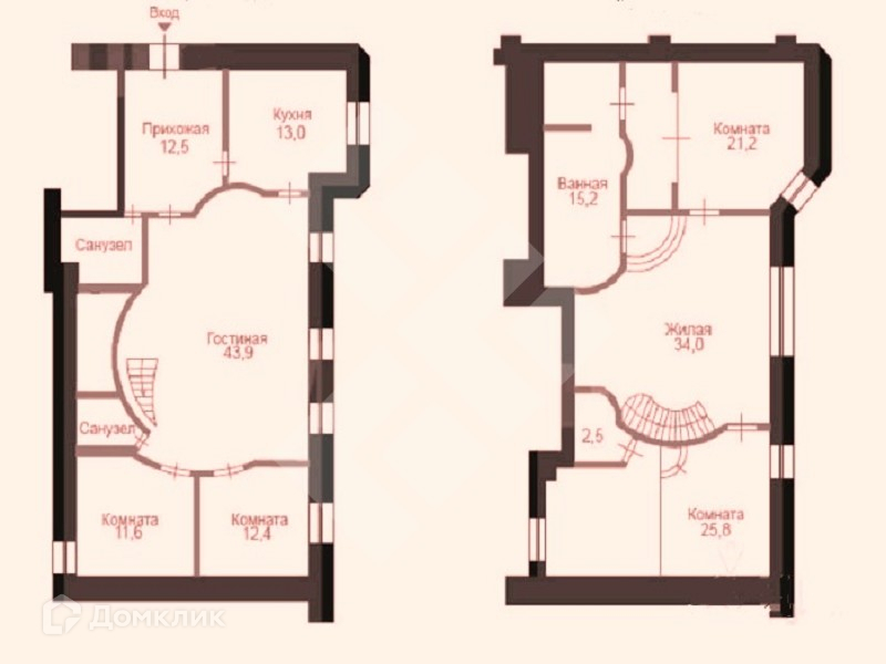 Подробная планировка: 1-й уровень: гостиная (45 кв.м) с дровяным камином (узаконен), 2 гостевые спальни (по 12 кв.м), 2 санузла, кухня 13 кв.м, гардеробная. 2-й уровень: две спальни (21 и 25 кв.м), гостиная-зал для домашнего кинотеатра (34кв.м), 1 санузел, гардеробная. Высота потолков 3,8м.