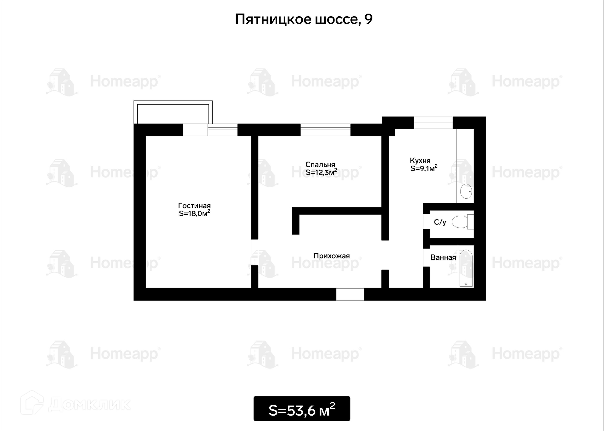 Общая площадь 53.6 м2