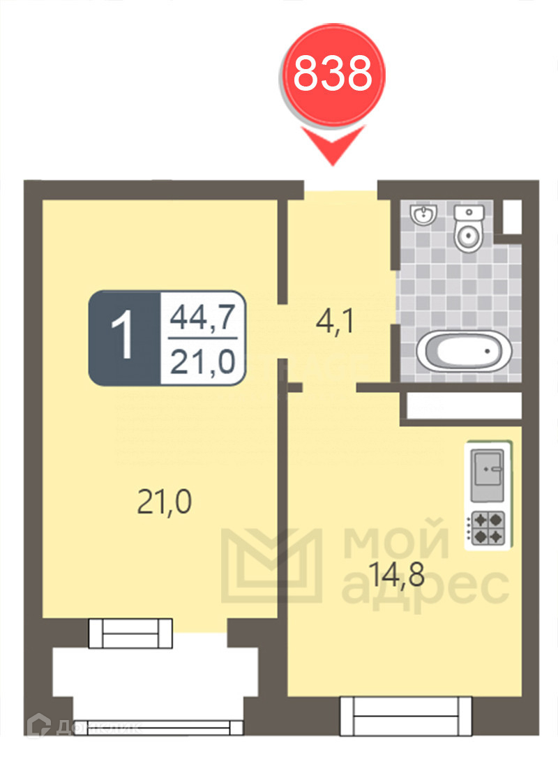 Общая площадь 44.7 м2