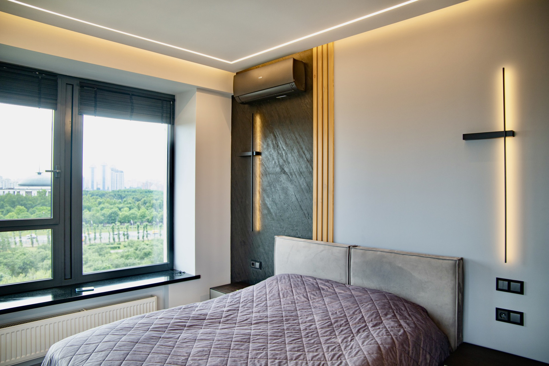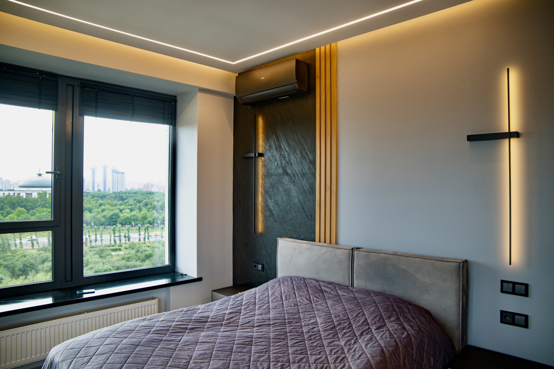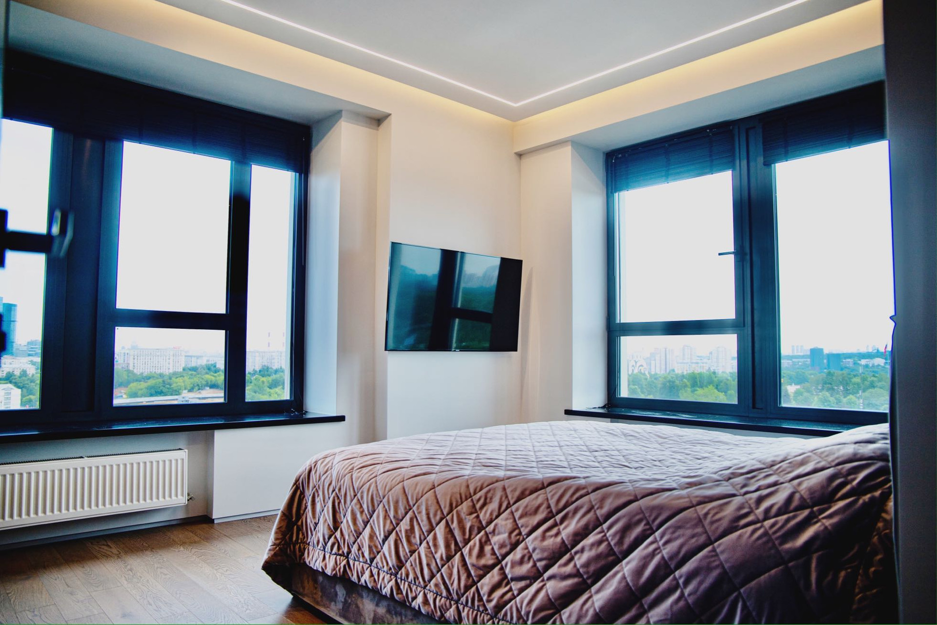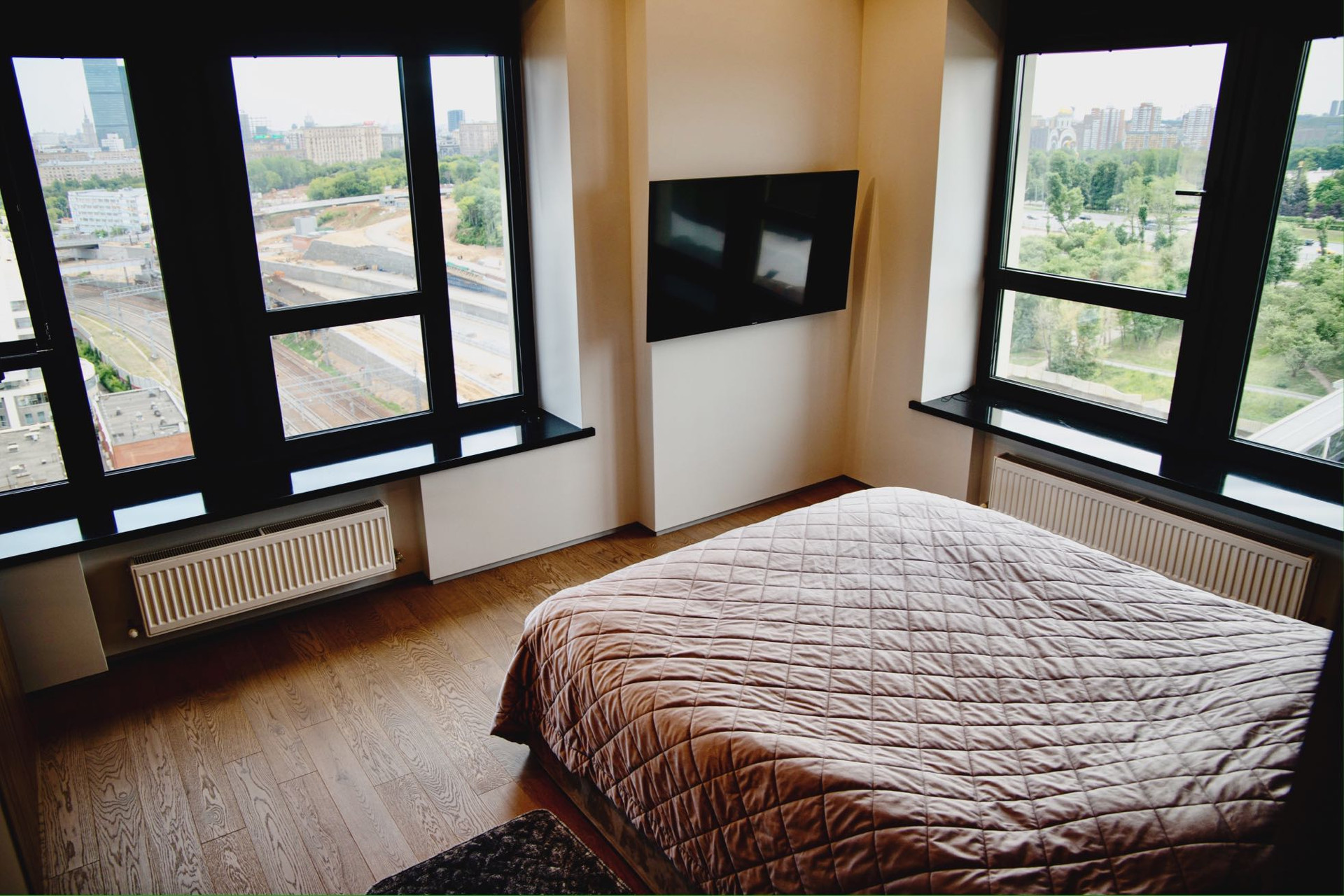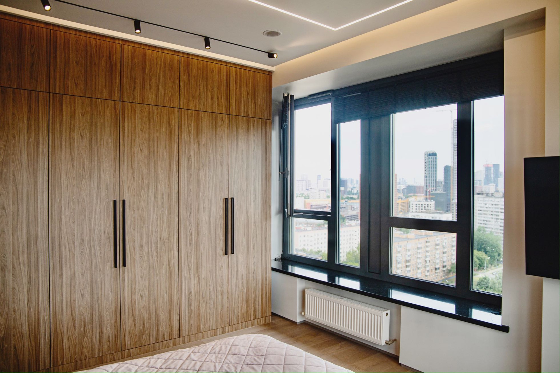 Спальня сочетает в себе уют и высокую практичность. В удобный и большой шкаф-купе можно поместить вещи и бытовые приборы, а из двух панорамных окон Вас каждый день будет радовать вид на Поклонную гору и деловой квартал «Москва-Сити», который особенно красив в темное время суток.