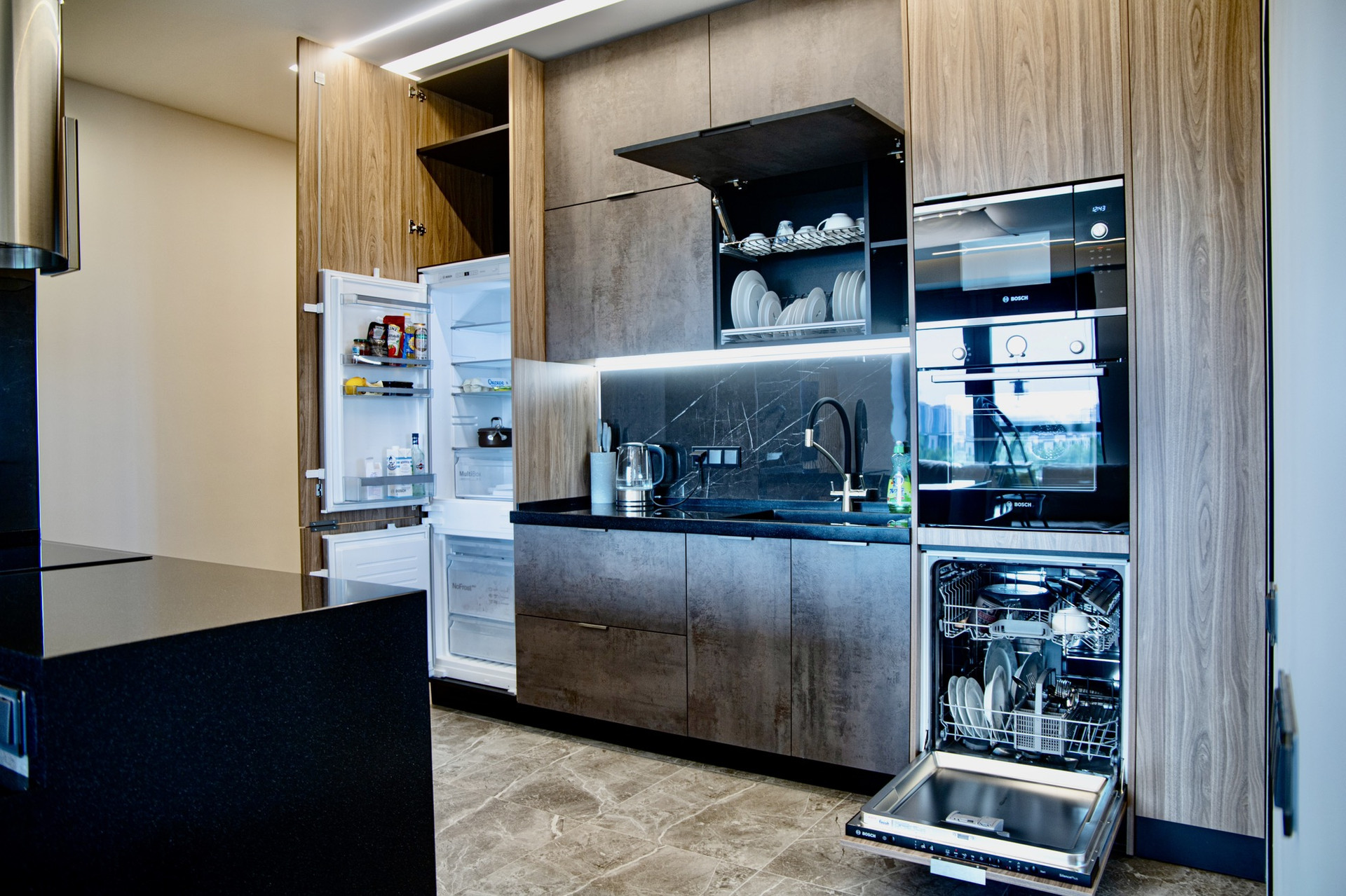 Кухня-гостиная оборудована качественным гарнитуром и современной встроенной техникой Bosch. Также здесь расположен огромный раскладной диван и ТВ-плазма.
