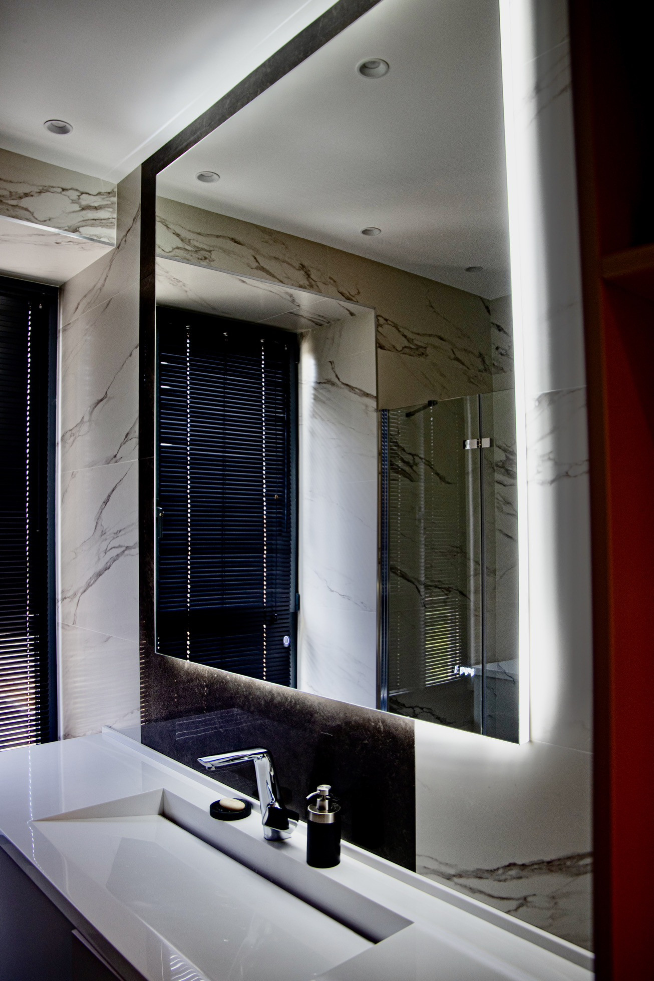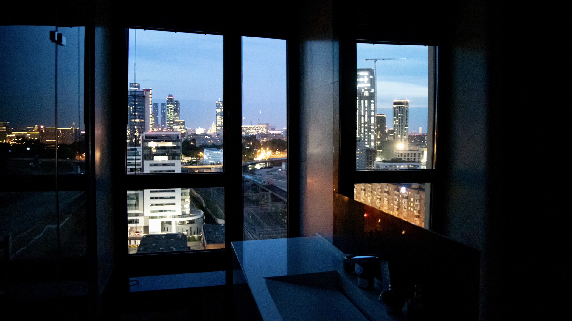 Роскошный вид на «Москва-Сити» открывается и из ванной комнаты, которая оборудована сантехникой Villeroy & Boch, а также новой стиральной машиной Bosch.