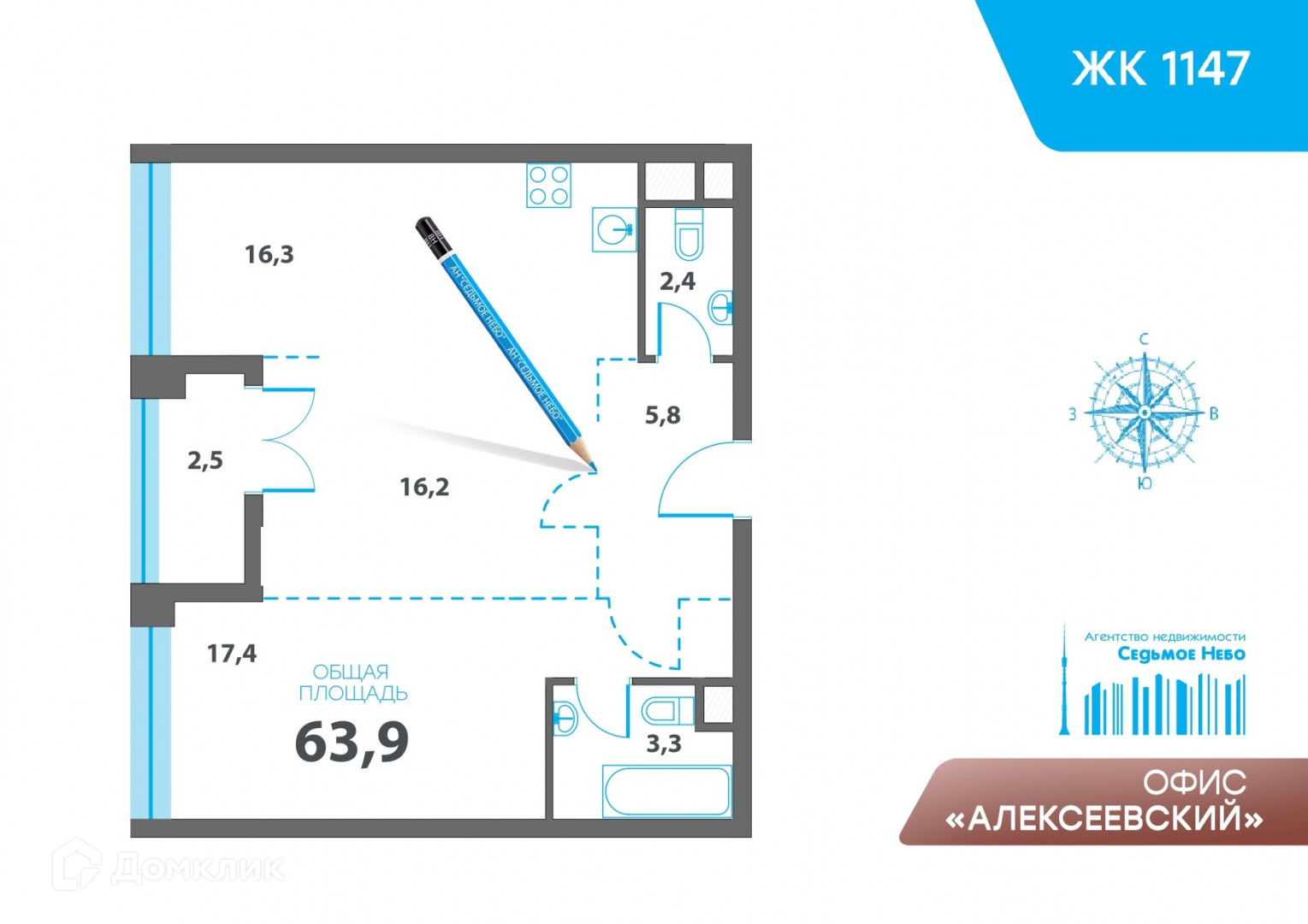 Общая площадь 64 м2