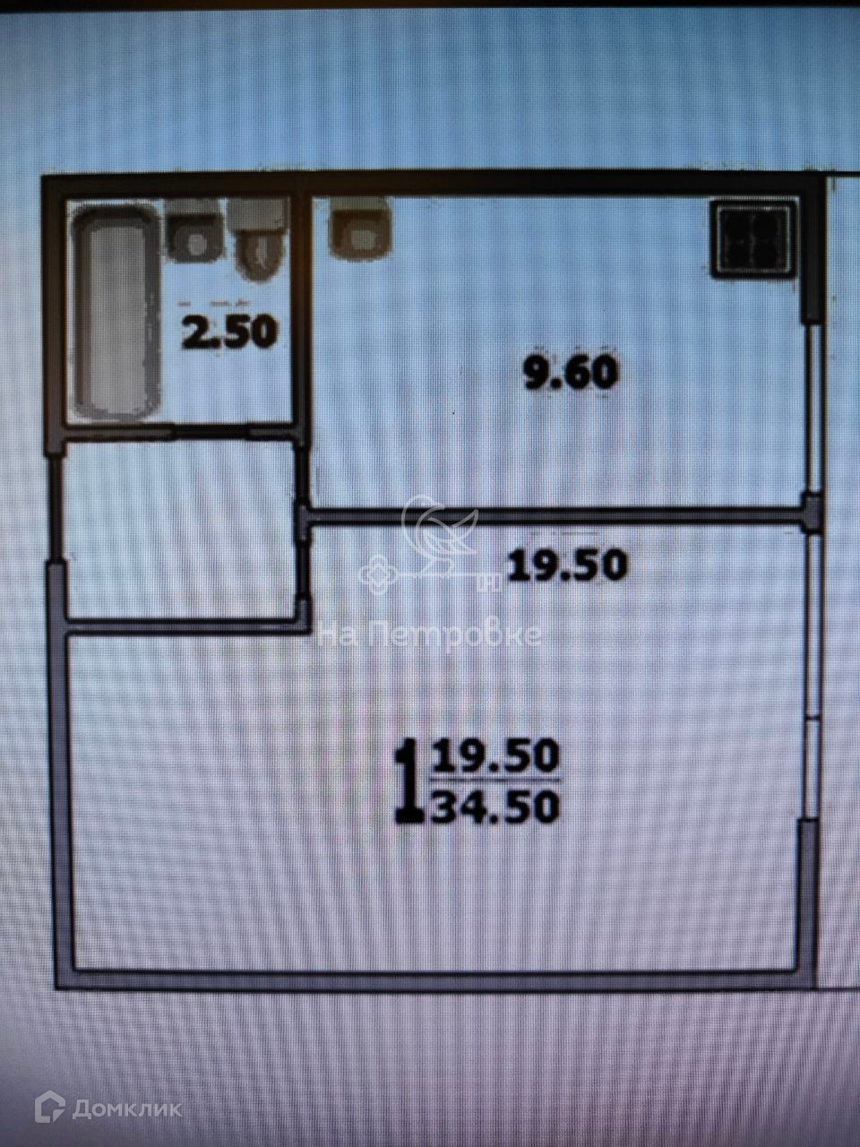 1 комнатную квартиру 34,5 м. кв., кухня 9,2 м. кв., комната 19,5 м. кв.,