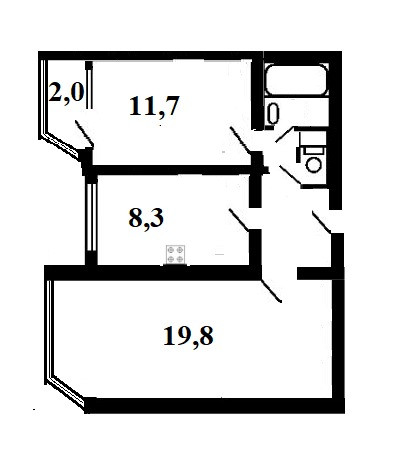 Общая площадь квартиры 53,9 кв.м., жилая 31,5 кв.м. Все комнаты изолированные (19,8 и 11,7 кв.м.), большая комната с эркером, на полу паркет. С/у раздельный, большая ванная комната. Кухня 8,3 кв.м., есть застекленная лоджия 2,0 кв.м.