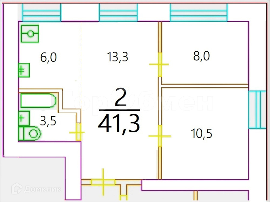 Общая площадь 41.3 м2