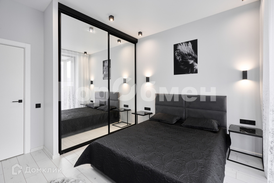 Спальня полностью обставлена всей необходимой мебелью.